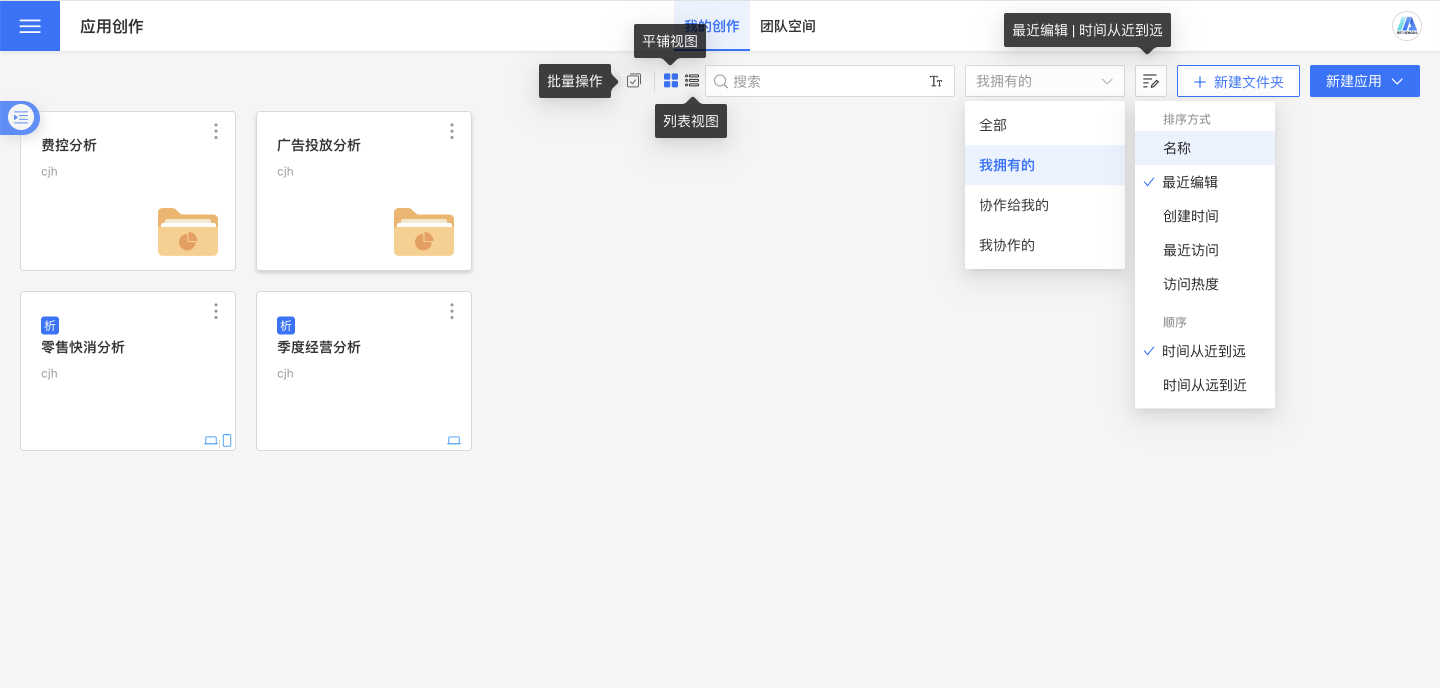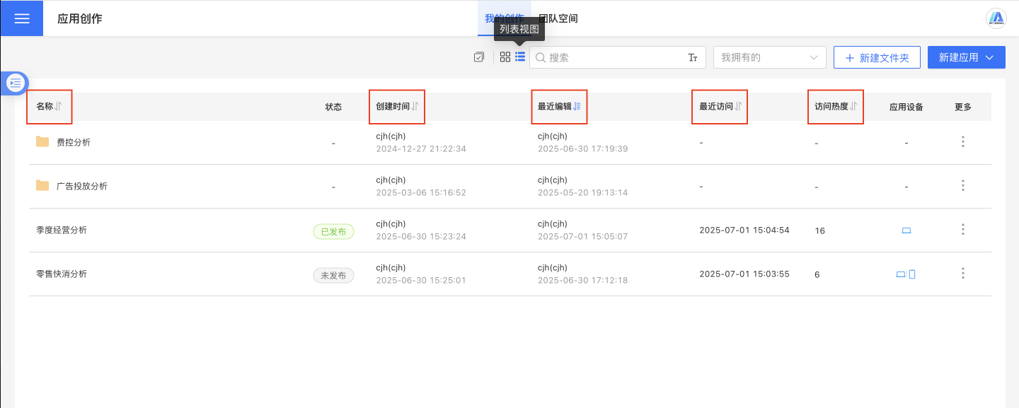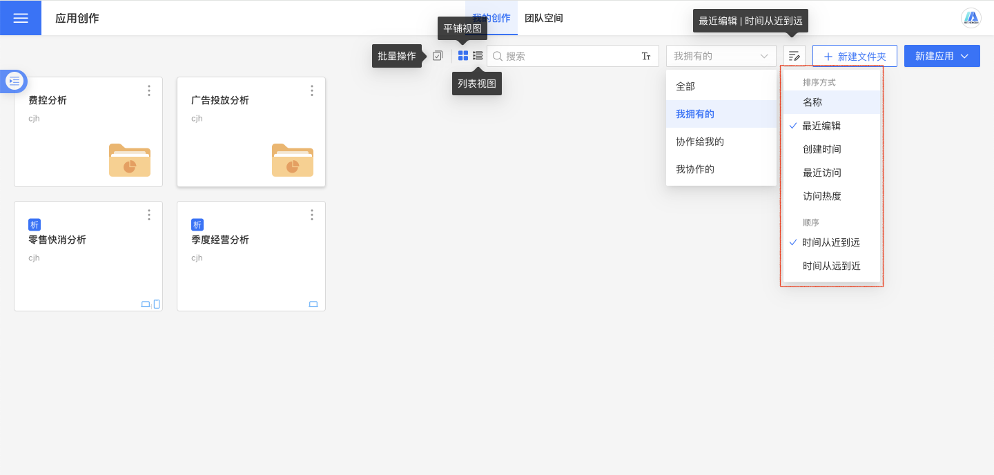应用列表页有排序按钮,可以按照名称、最近编辑、创建时间、最近访问、访问热度进行排序。平铺模式和列表模式下排序功能使用方式不同。