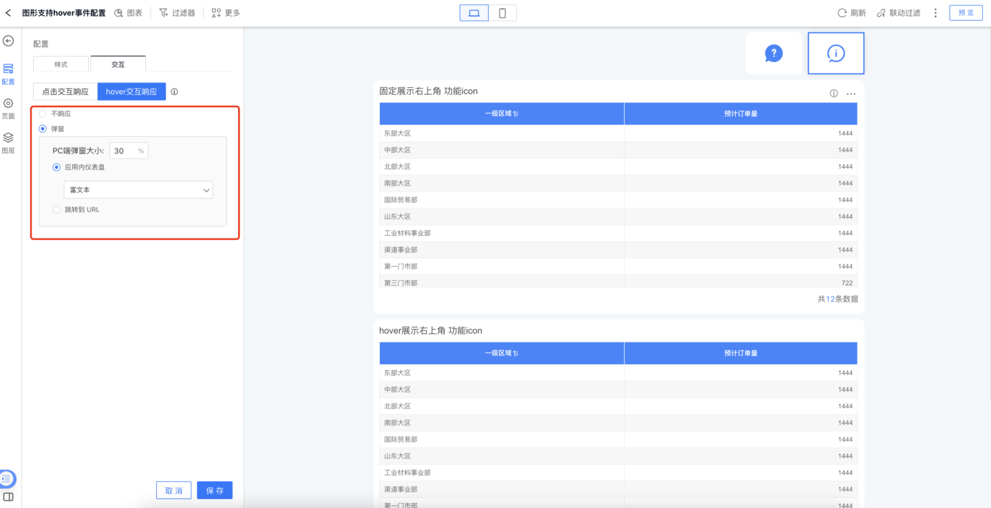 形状控件还支持设置 hover 事件交互,支持鼠标 hover 在图标上时打开弹窗,弹窗内容可自定义为应用内仪表盘或是其他 URL。 ![]()
