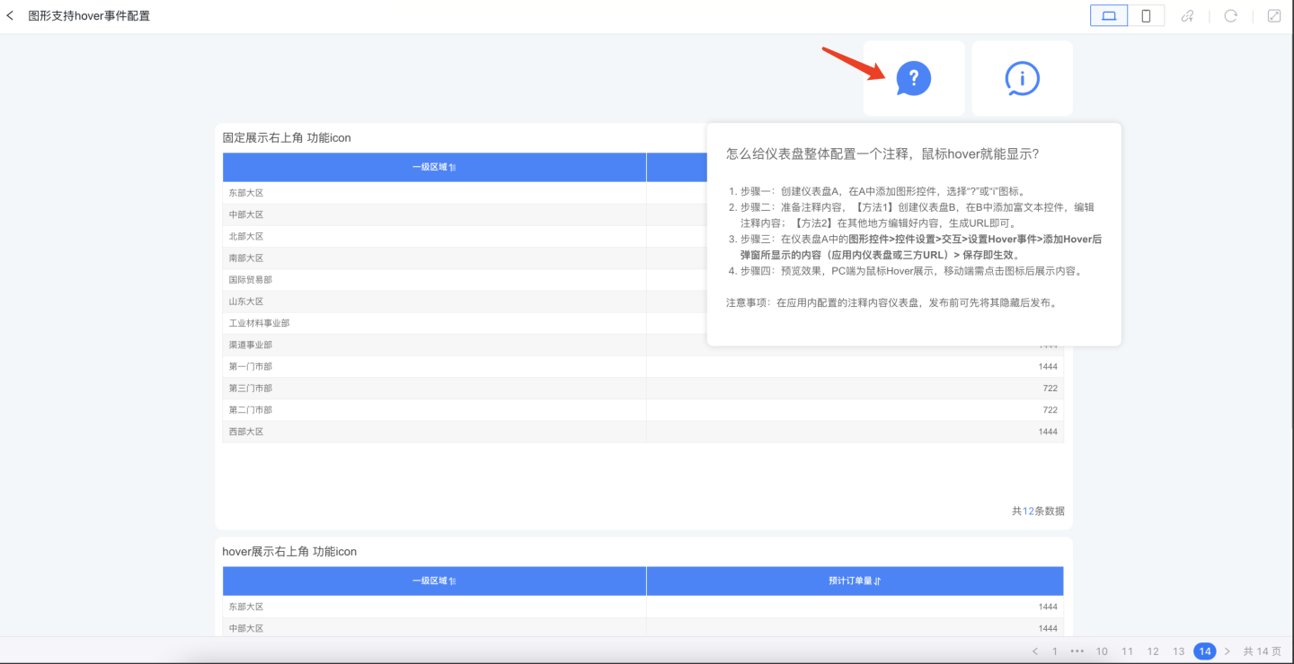 hover 打开弹窗场景示例:当数据分析师想对整个仪表盘或某组图表进行全局注释说明时可使用该交互,如下图。 ![]()