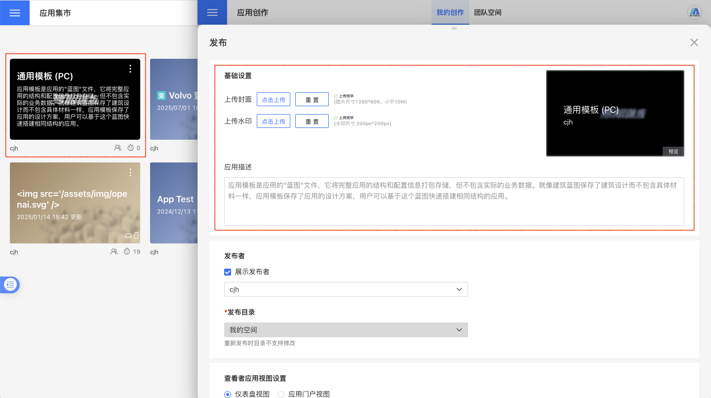 发布后的应用不会随着应用创作中的应用而变化。当应用创作中的内容更新时,可以通过重新发布,更新应用集市中的应用。重新发布设置页面与发布设置页面相同,除发布目录不能修改,其他设置都支持修改。