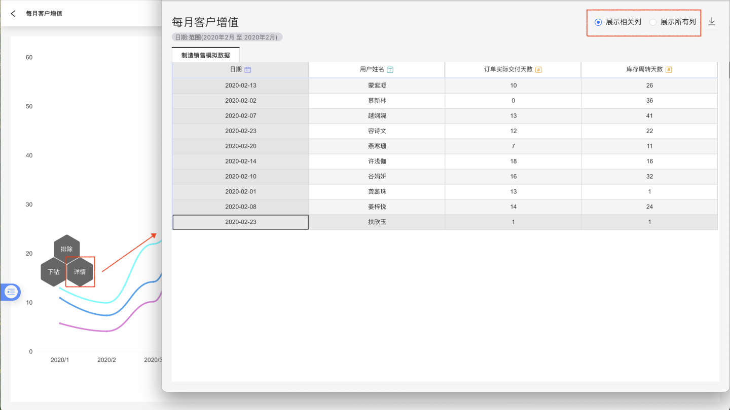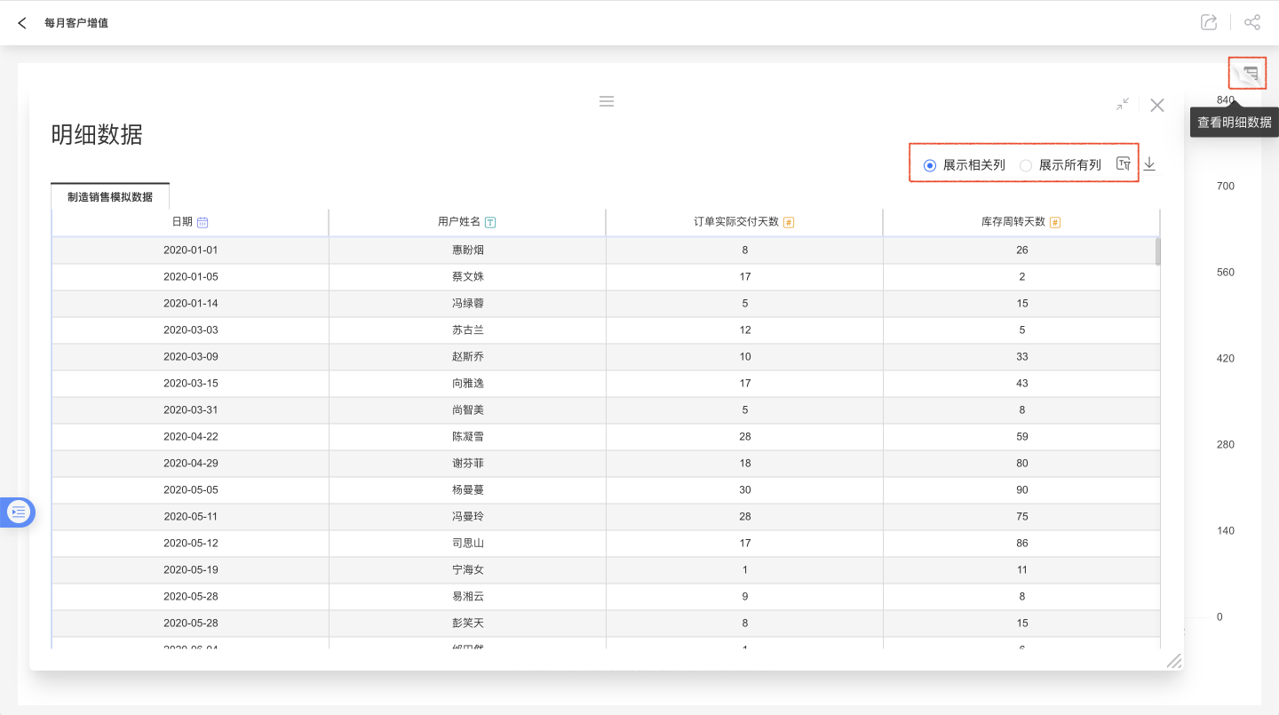 入口2: 图表打开后,点击右上角的查看明细数据 ,可以查看当前图表中使用到的字段的明细数据。支持查看相关列和所有列信息。 相关列展示了图表中的相关数据。所有列包括了制作图表中所用的数据集的所有信息。同时支持使用过滤条件筛选数据。