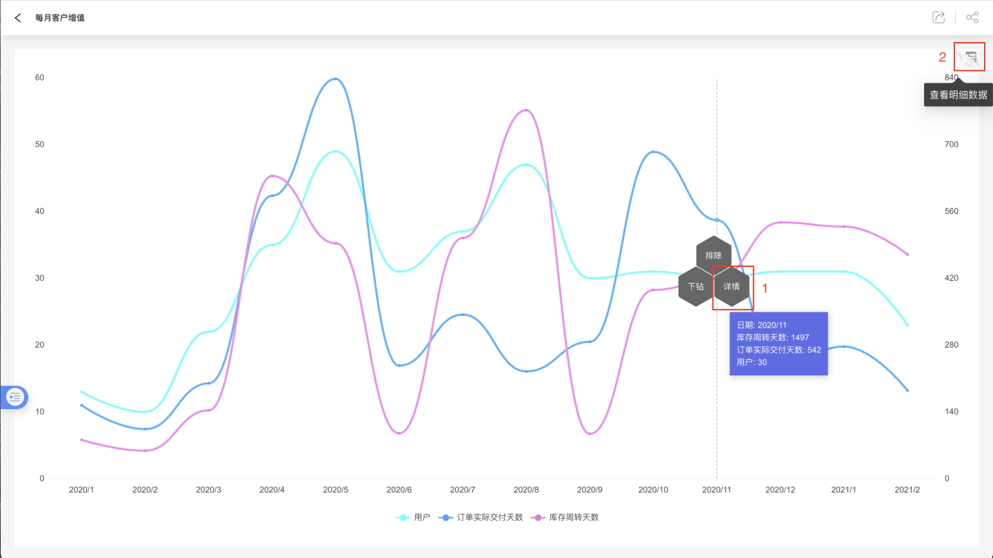 开启查看明细数据功能后,在应用集市的图表中可以看到图表的详细数据。打开每个图表后可以看到查看数据的两个入口。