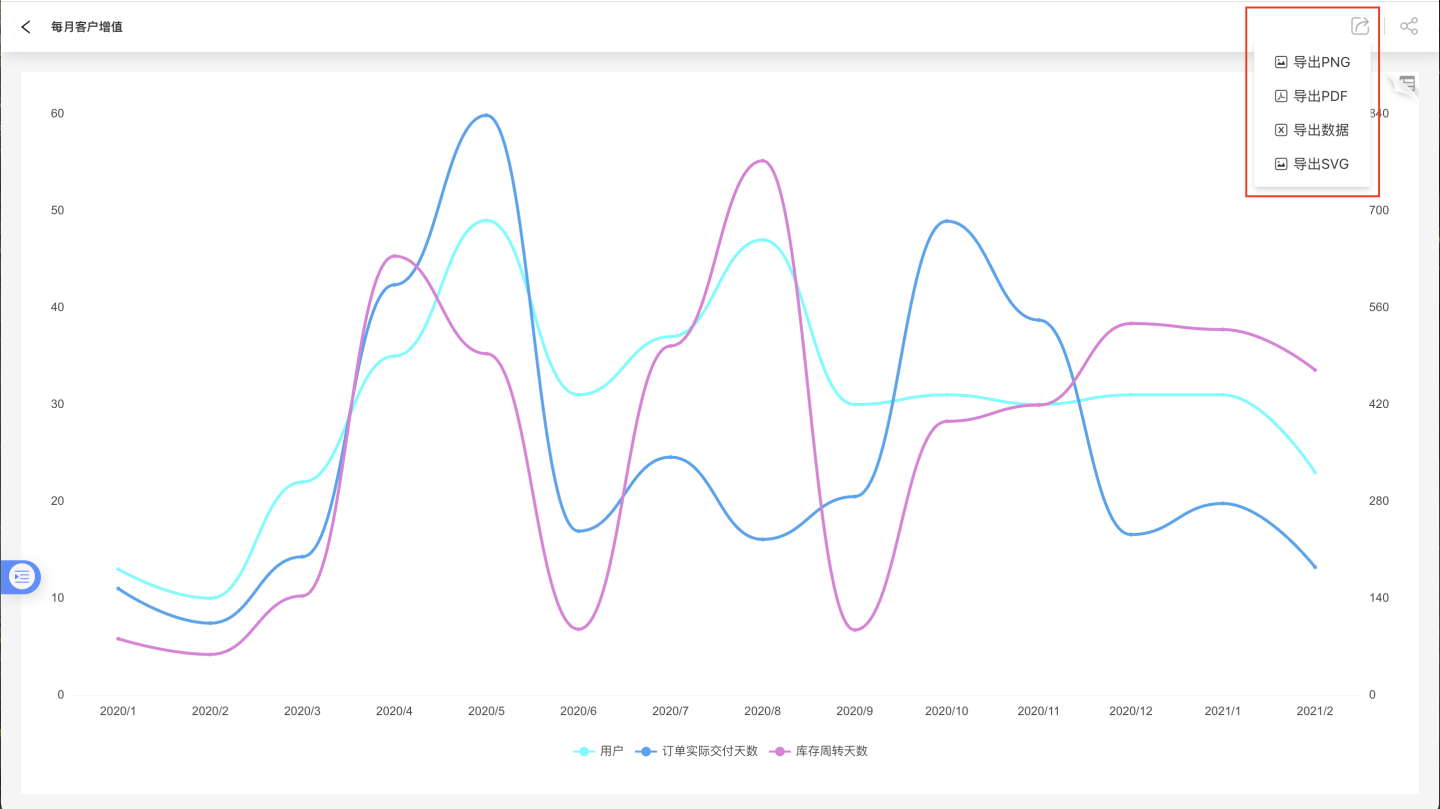 图表导出功能可以导出图表的 PNG、PDF、数据、SVG(矢量图形)。