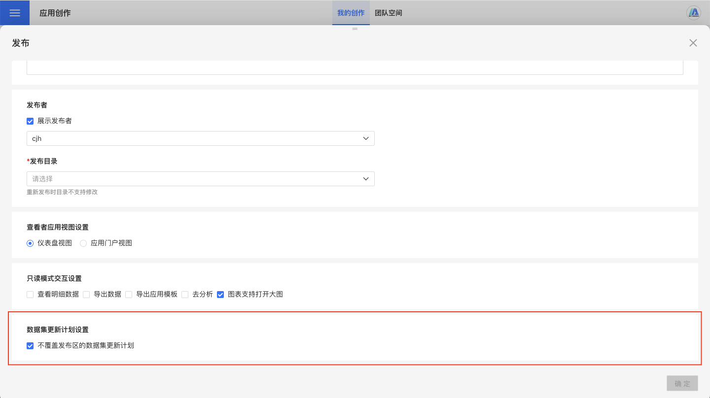 发布应用的时候也可以选择将创作区设置好的任务计划覆盖到发布区中。默认的行为是不覆盖,也就是保留应用集市中原有的执行计划。