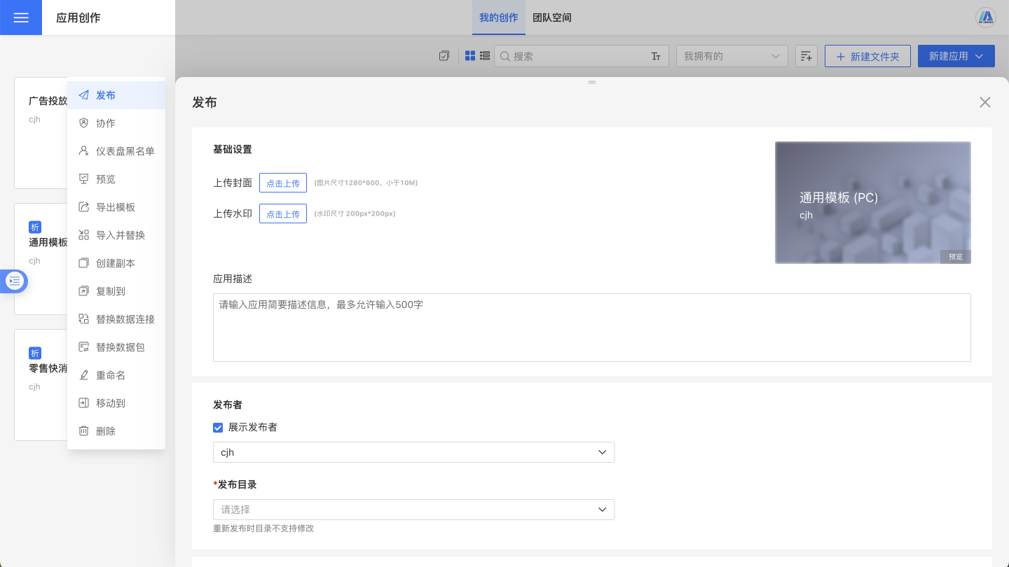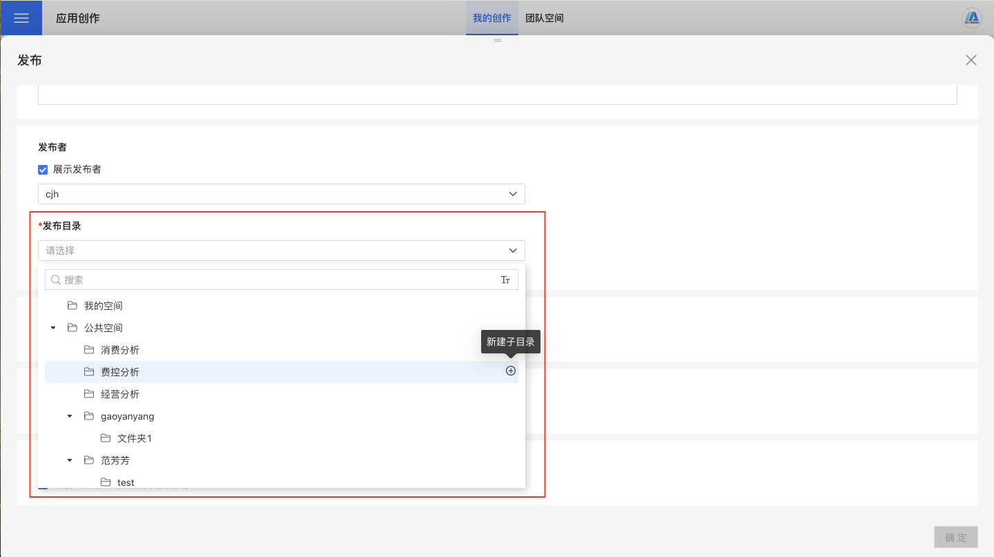应用发布时可以选择应用集市中有管理者、编辑者权限的目录进行发布。同时也可以在相应文件夹下新增子文件夹方便管理。