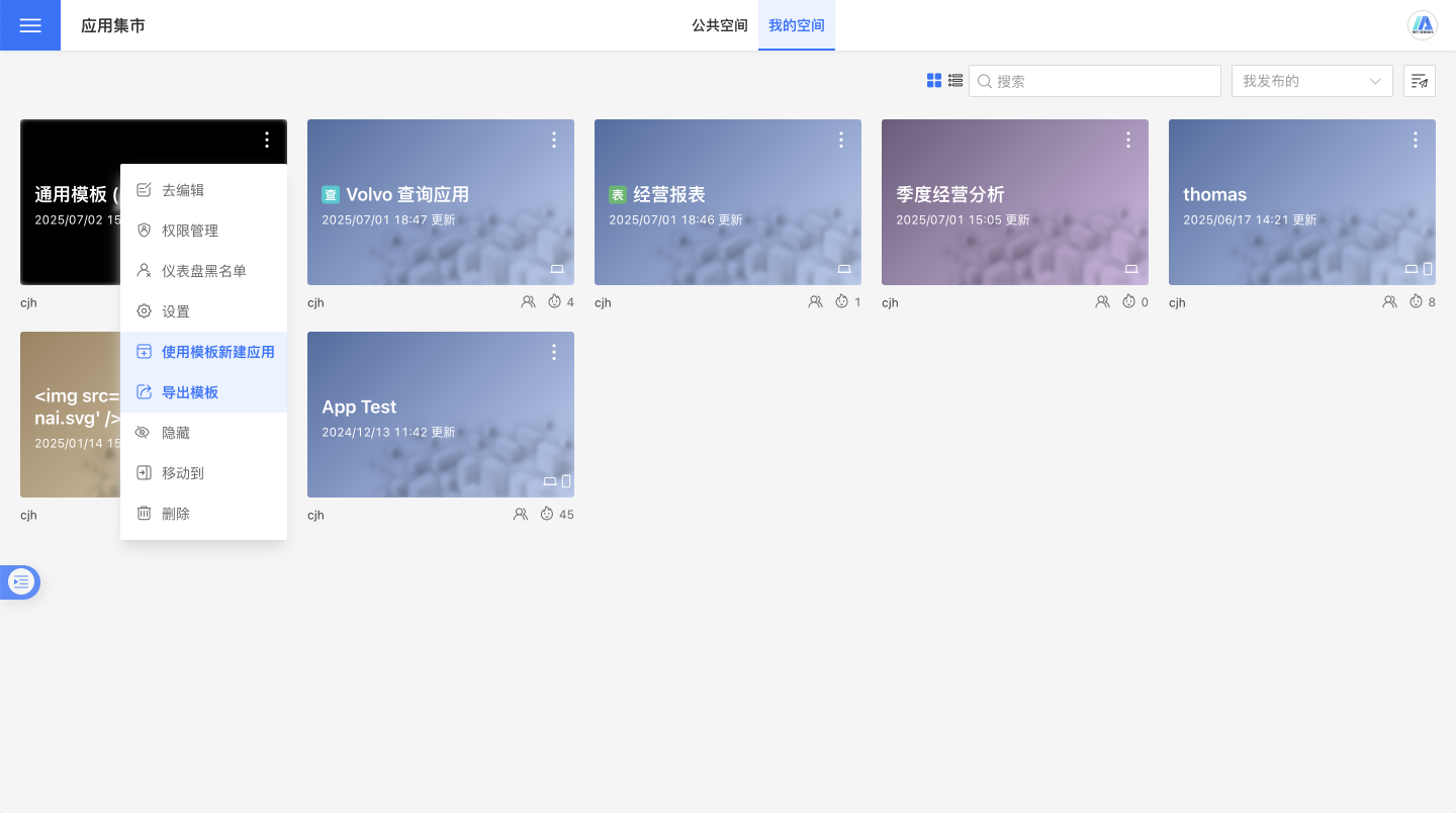 开启导出应用模板后,在应用的三点菜单中会出现使用模板新建应用和导出模板按钮,模板的用法参考使用模板创建应用。