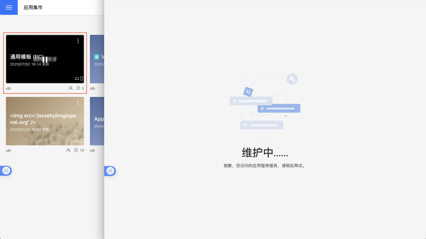 应用集市发布的应用会展示暂停状态,打开时提示维护中等信息,用户了解应用的状态。