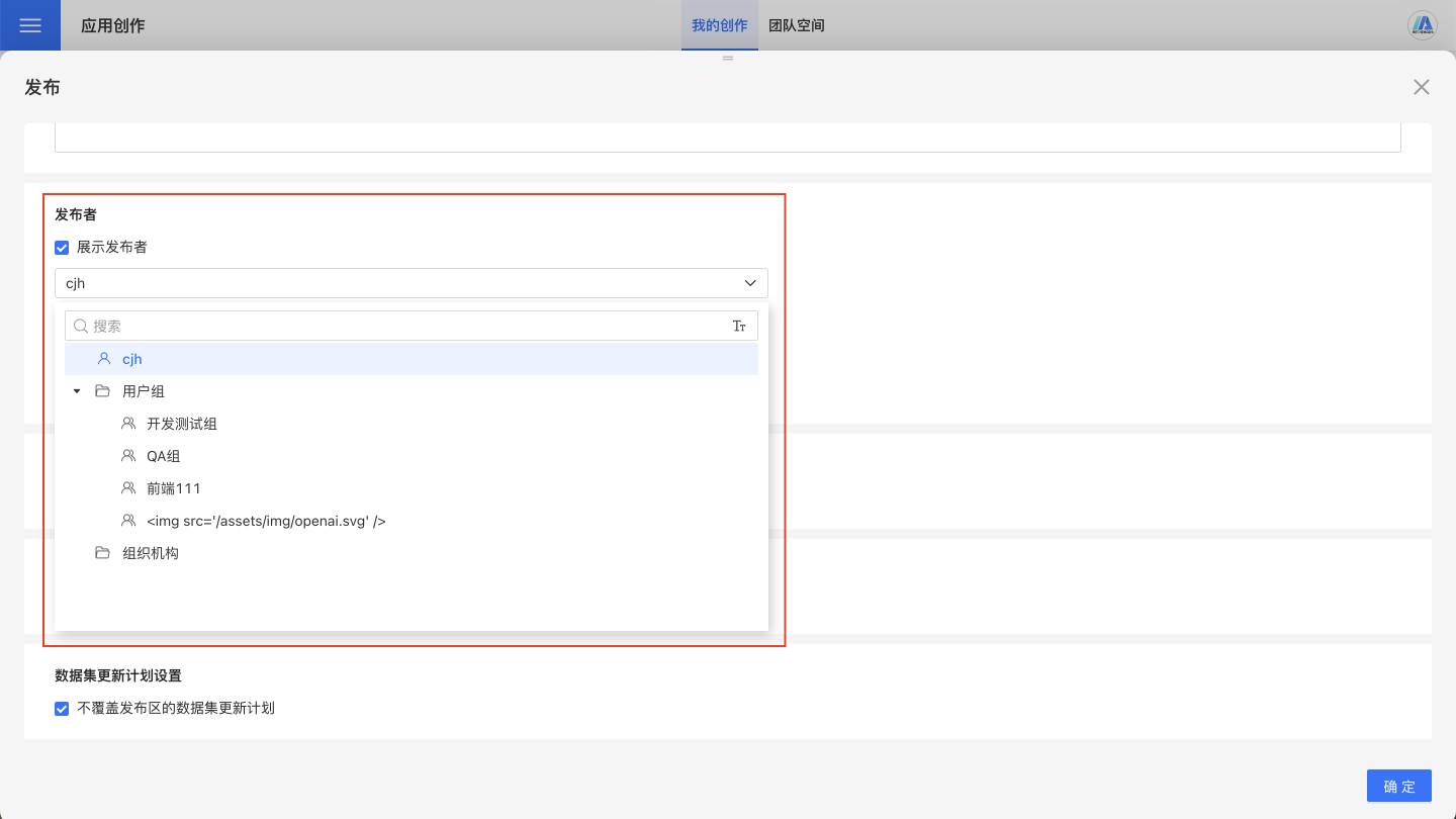 应用发布时可以选择是否展示发布者。展示时可以选择当前用户、用户所在的组、用户所在的组织机构作为发布者,满足不同发布场景的需求。