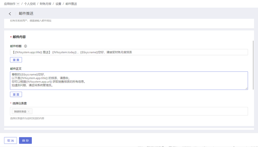 - 邮件内容:包括邮件标题、邮件正文、选择仪表盘。 邮件内容支持自定义纯文本、支持系统参数、应用参数和用户属性。