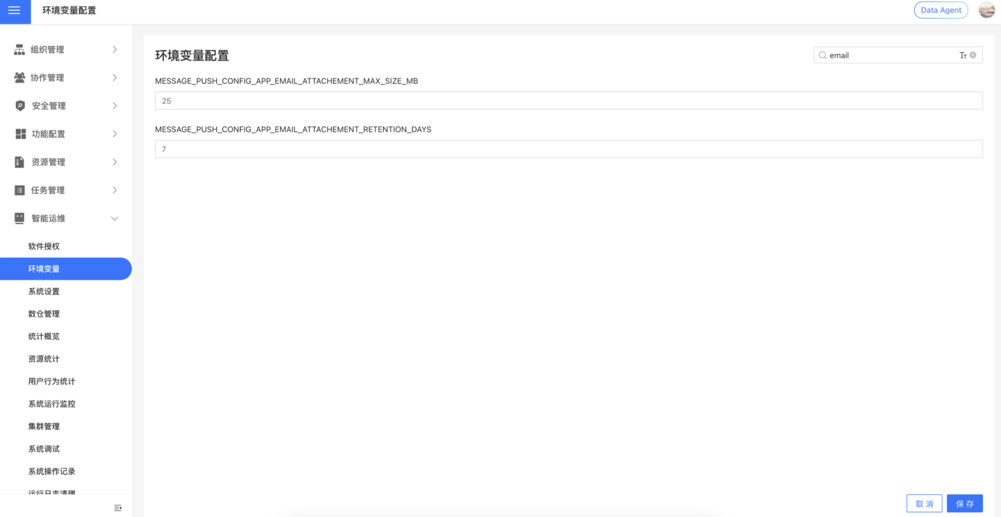 MESSAGE_PUSH_CONFIG_APP_EMAIL_ATTACHEMENT_MAX_SIZE_MB控制,默认25M。 - 生成的下载链接有有效期,可通过环境变量