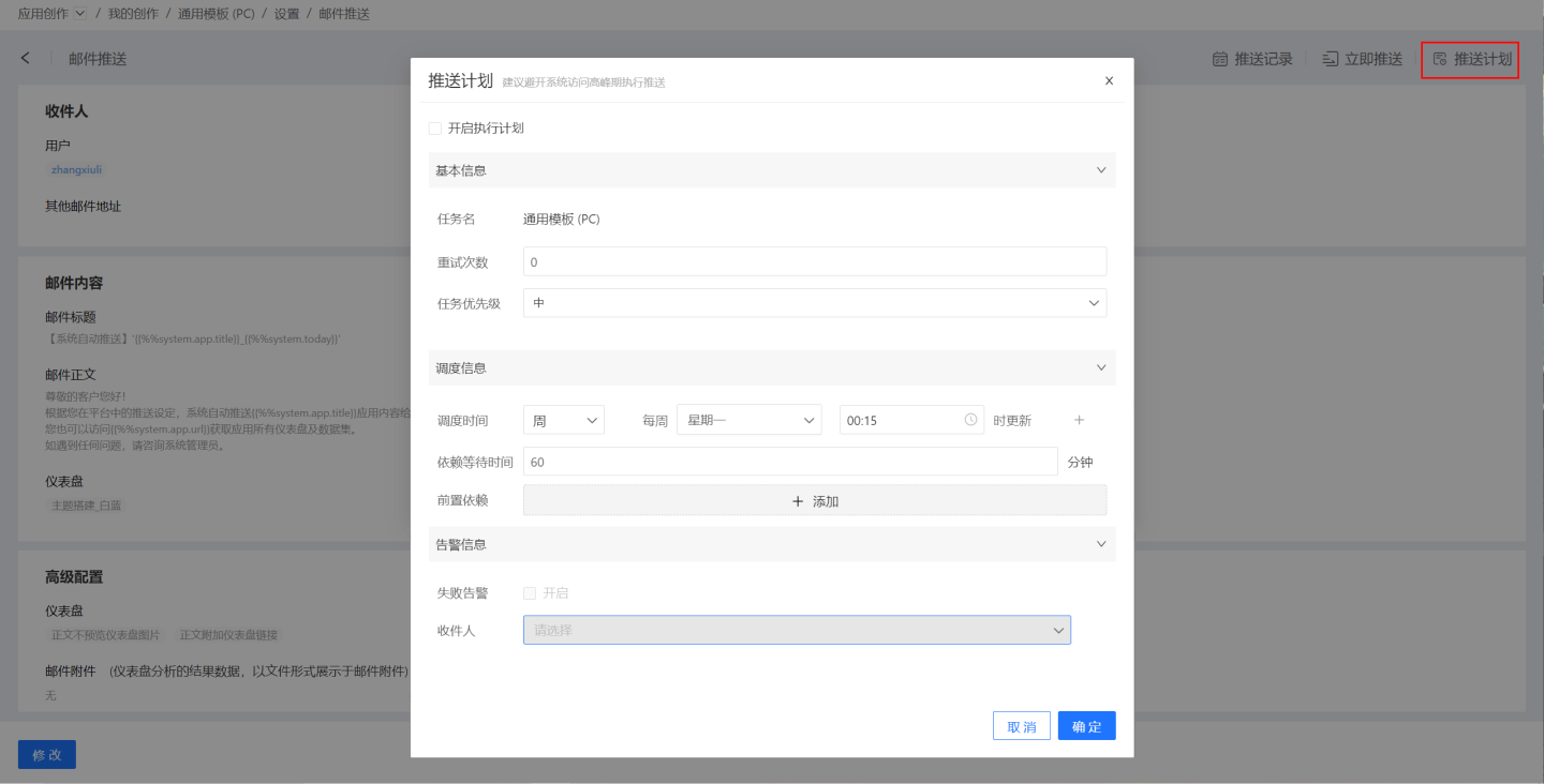 邮件订阅设置完成,在订阅列表页面点击订阅时展示为设置详情。在详情页右上角可以点击“立即推送”,将应用立即推送给目标对象。也可以选择“推送计划”设置定时邮件推送,邮件即在约定的时间送达收件人。