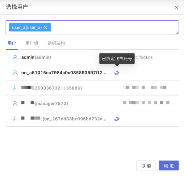 飞书、钉钉、企业微信推送方式在选择系统内用户时,用户选择界面将会展示用户是否绑定了对应第三方应用的账号。