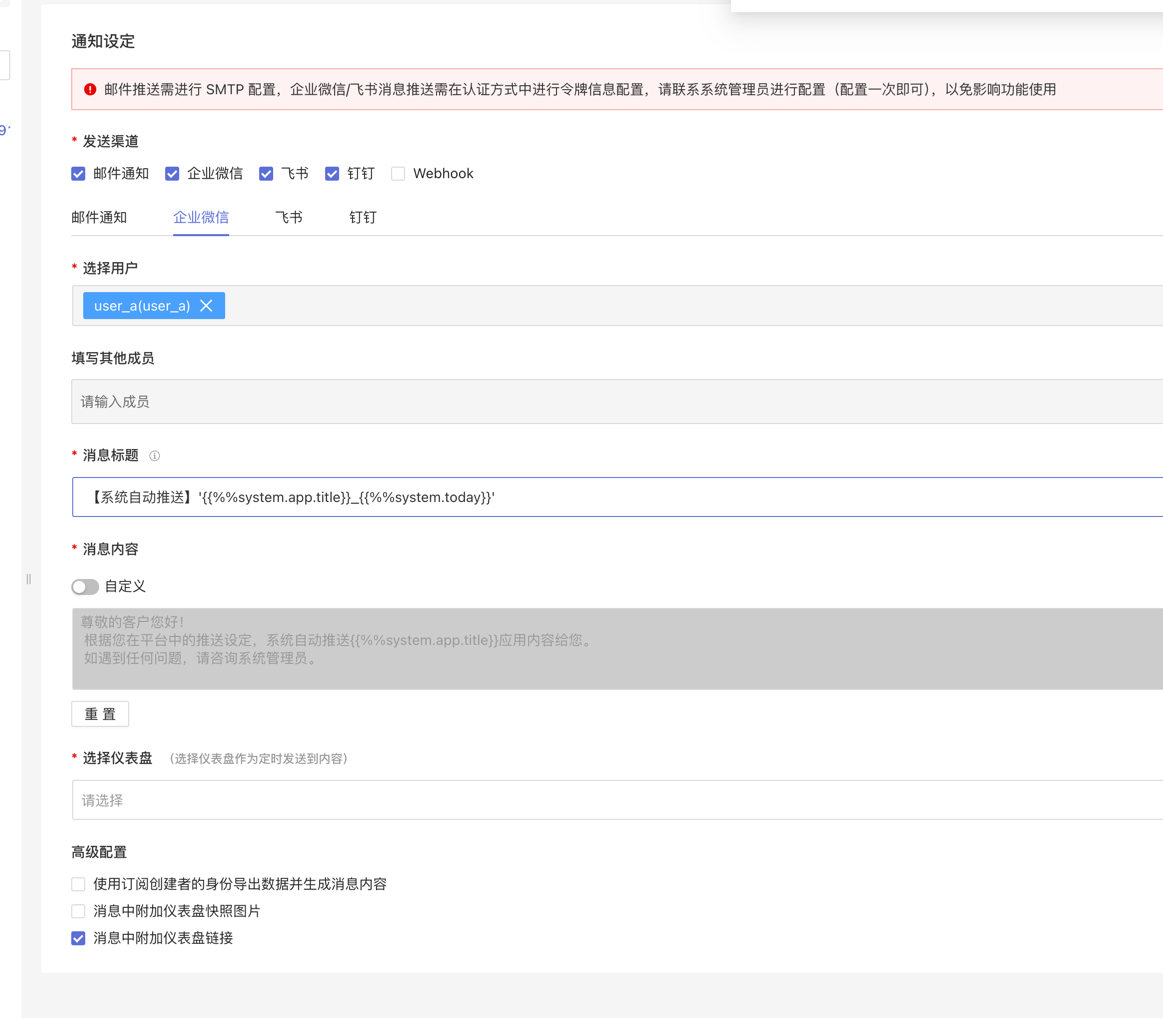 企业微信方式是以企业微信消息的形式通知用户,并且支持在消息中添加仪表盘信息。 企业微信方式开启前需要在认证方式中进行令牌信息配置,请联系系统管理员进行配置(配置一次即可),否则会影响功能使用。