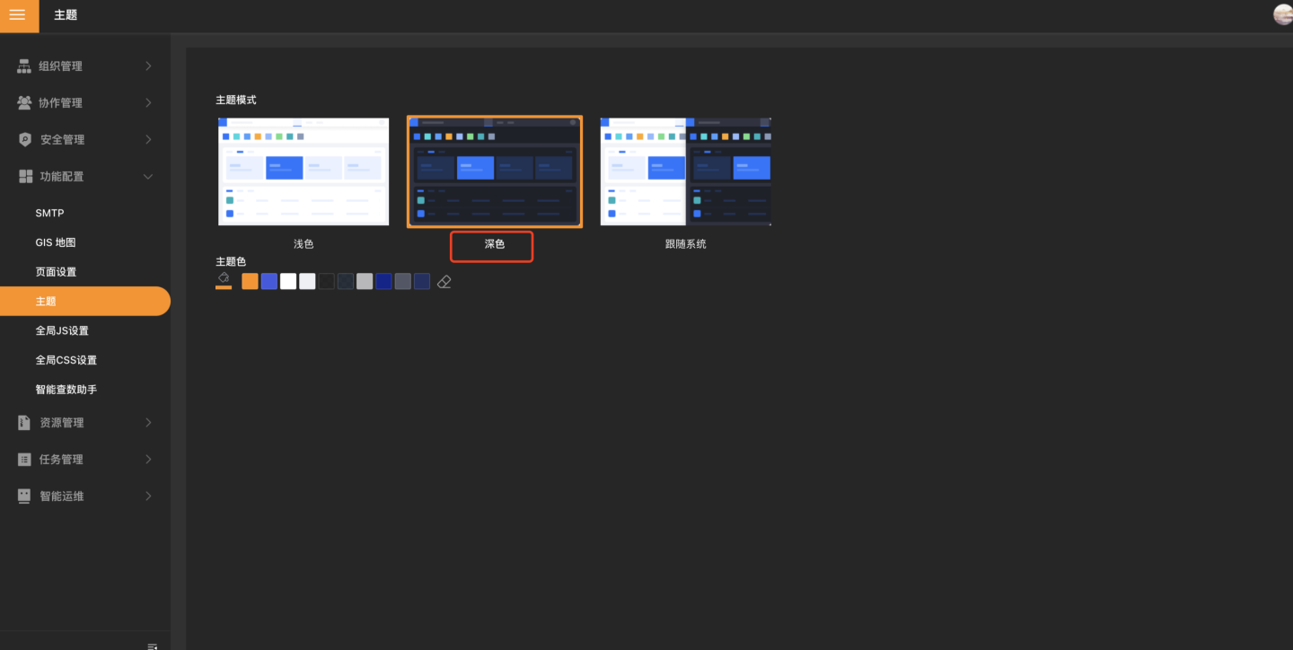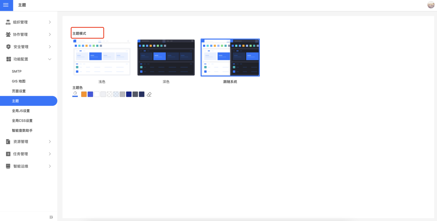 系统支持各种场景嵌入,在某些嵌入场景下,HENGSHI SENSE 系统主题模式以及主题颜色和被嵌入系统的不一致,这种情况下用户可以修改主题配置。如图是主题设置界面,主题模式提供了浅色、深色和跟随系统三种可选项。