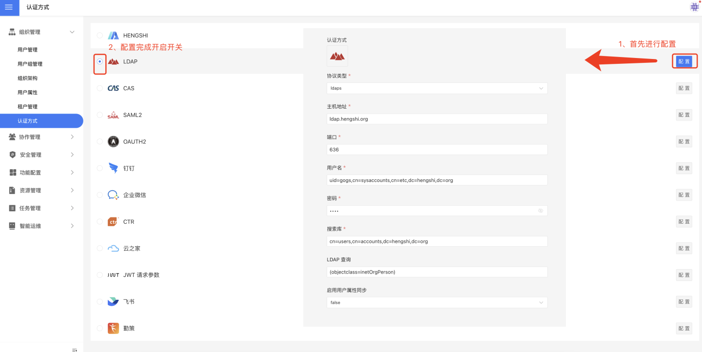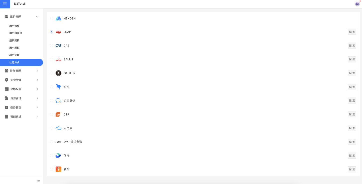 在设置->组织管理->认证方式中设置用户登录系统的认证方式。目前支持 HENGSHI、LDAP、CAS、SAML2、OAUTH2、钉钉、企业微信、CTR、云之家、JWT 请求参数、飞书、勤策等多种认证方式。
