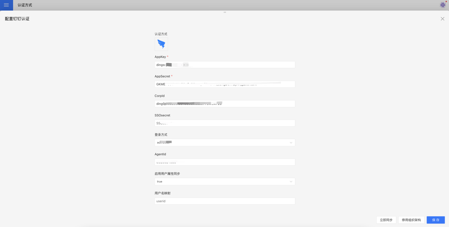 | 同步频率 | 否 | 对组织架构同步进行配置,单位为分钟,0为不同步。如果需要组织架构同步,则必须要配置 AppKey 和 AppSecret 并且应用要开通权限管理中的通讯录权限 |