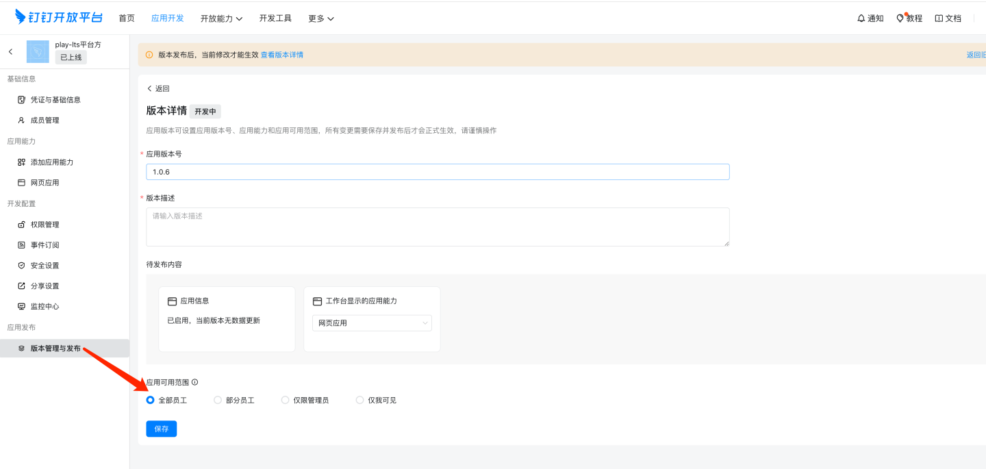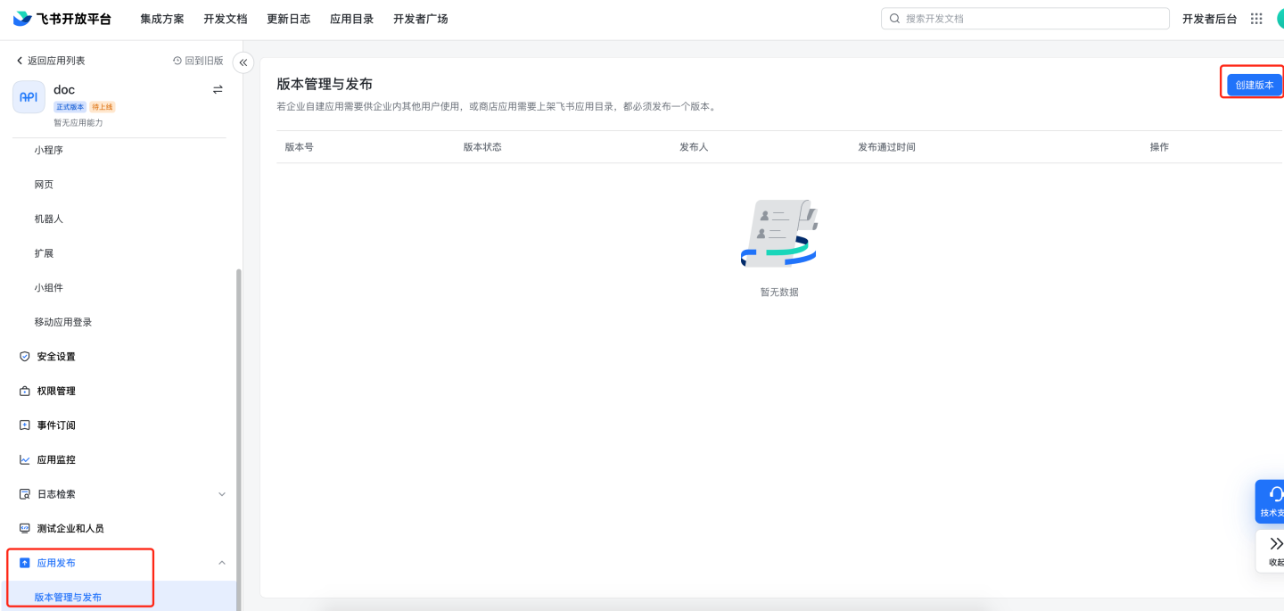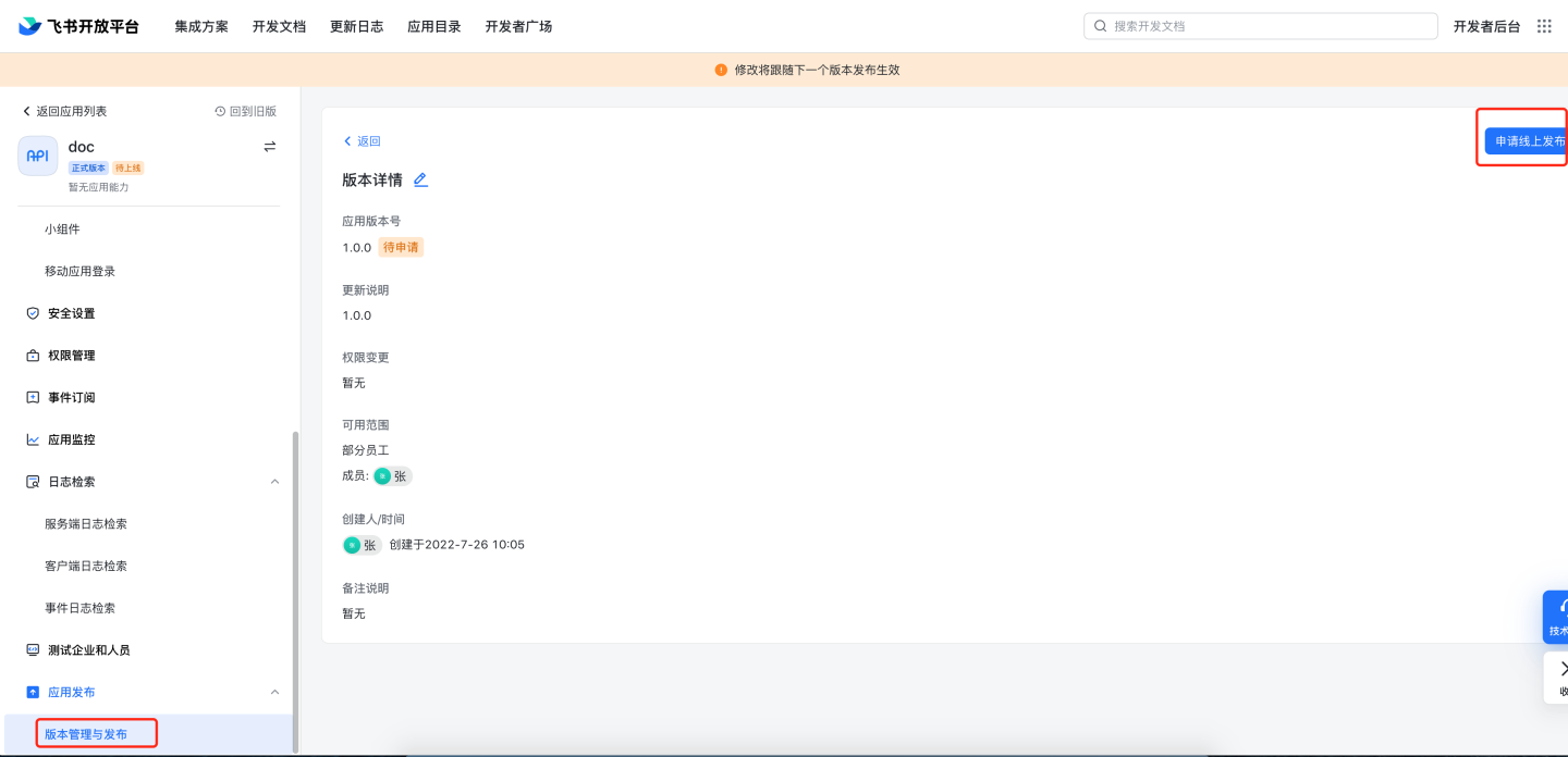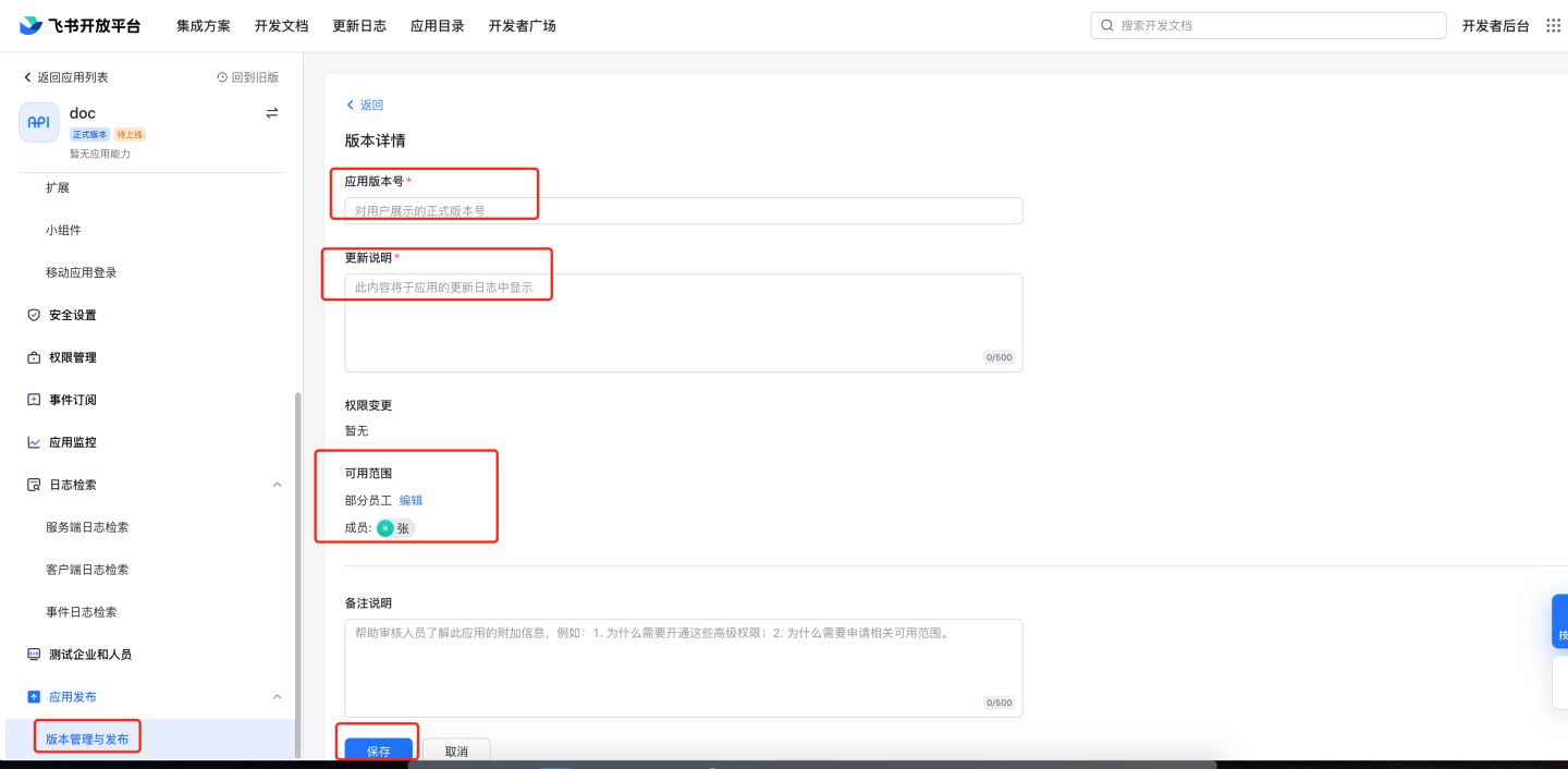 contact:user.base:readonly,contact:contact:readonly_as_app,contact:contact.base:readonly,admin:app.user_usable:readonly,contact:user.department:readonly,contact:user.email:readonly,contact:user.employee_id:readonly,contact:group:readonly,contact:user.id:readonly,contact:user.phone:readonly,contact:user.gender:readonly,contact:user.job_level:readonly,mail:user_mailbox:readonly,corehr:person.email:read,im:message,im:message:send_as_bot,im:message:send_multi_depts,im:message:send_multi_users,im:resource版本管理与发布,创建版本,根据需要及飞书要求填写应用版本号,更新说明,选择可用范围。申请线上发布。