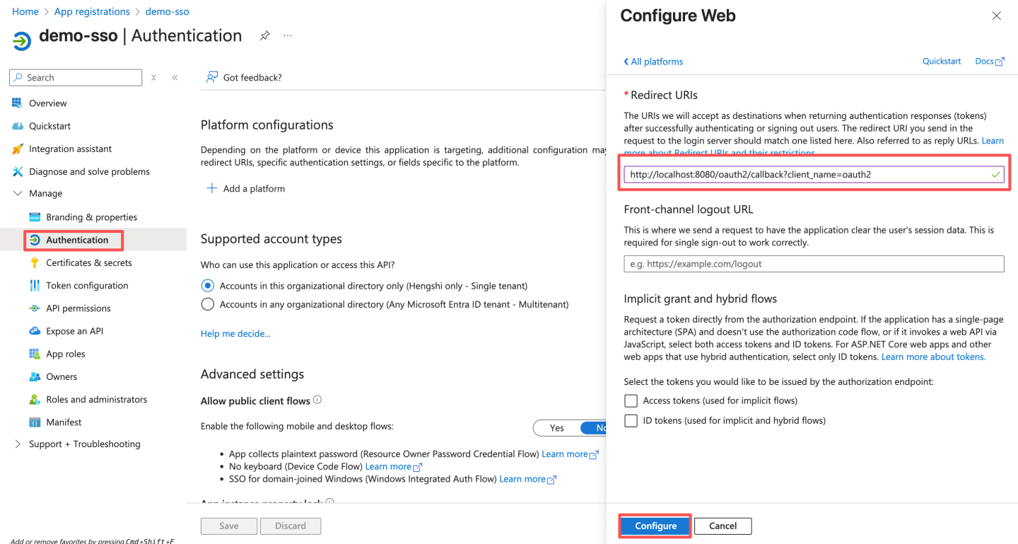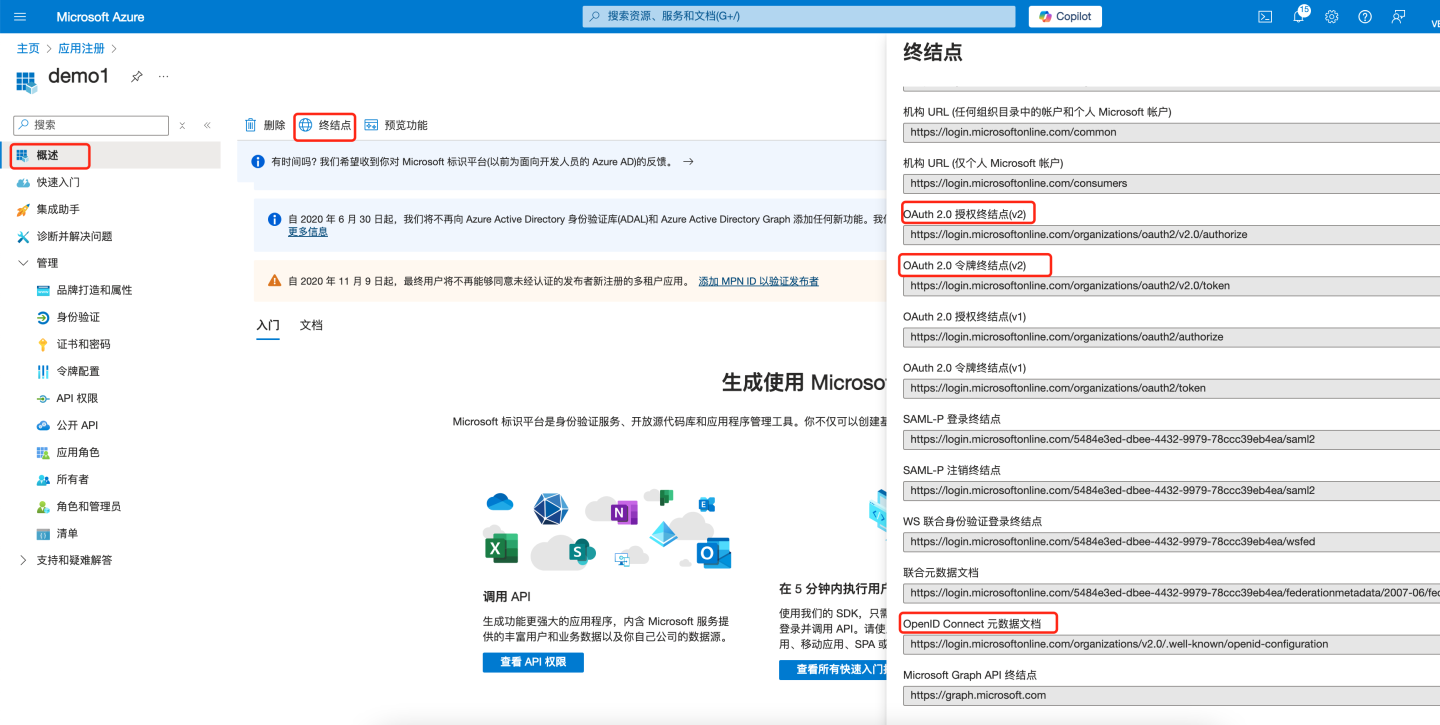 将"OAuth 2.0 授权终结点(v2)"配置到 HengShi Oauth 认证中的 "Authorize 接口"。 将"OAuth 2.0 令牌终结点(v2)"配置到 HengShi Oauth 认证中的 "Token 接口"。 打开"OpenID Connect 元数据文档"下面的网址 : 将"userinfo_endpoint"配置到 HengShi Oauth 认证中的 "User-info 接口"。 将openid配置到 HengShi Oauth 认证中的 "Scope"。