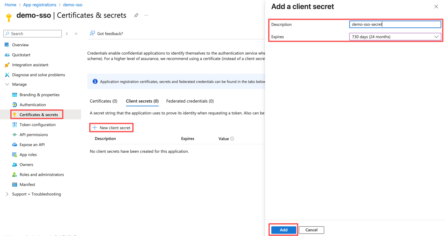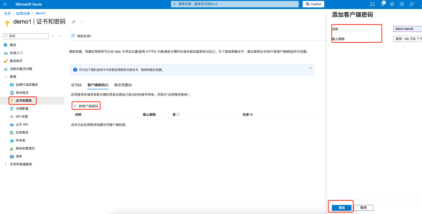 - 在左窗格中的 "管理"下,选择" 证书和密码"。点击右侧页面的" + 新建客户端密码"。