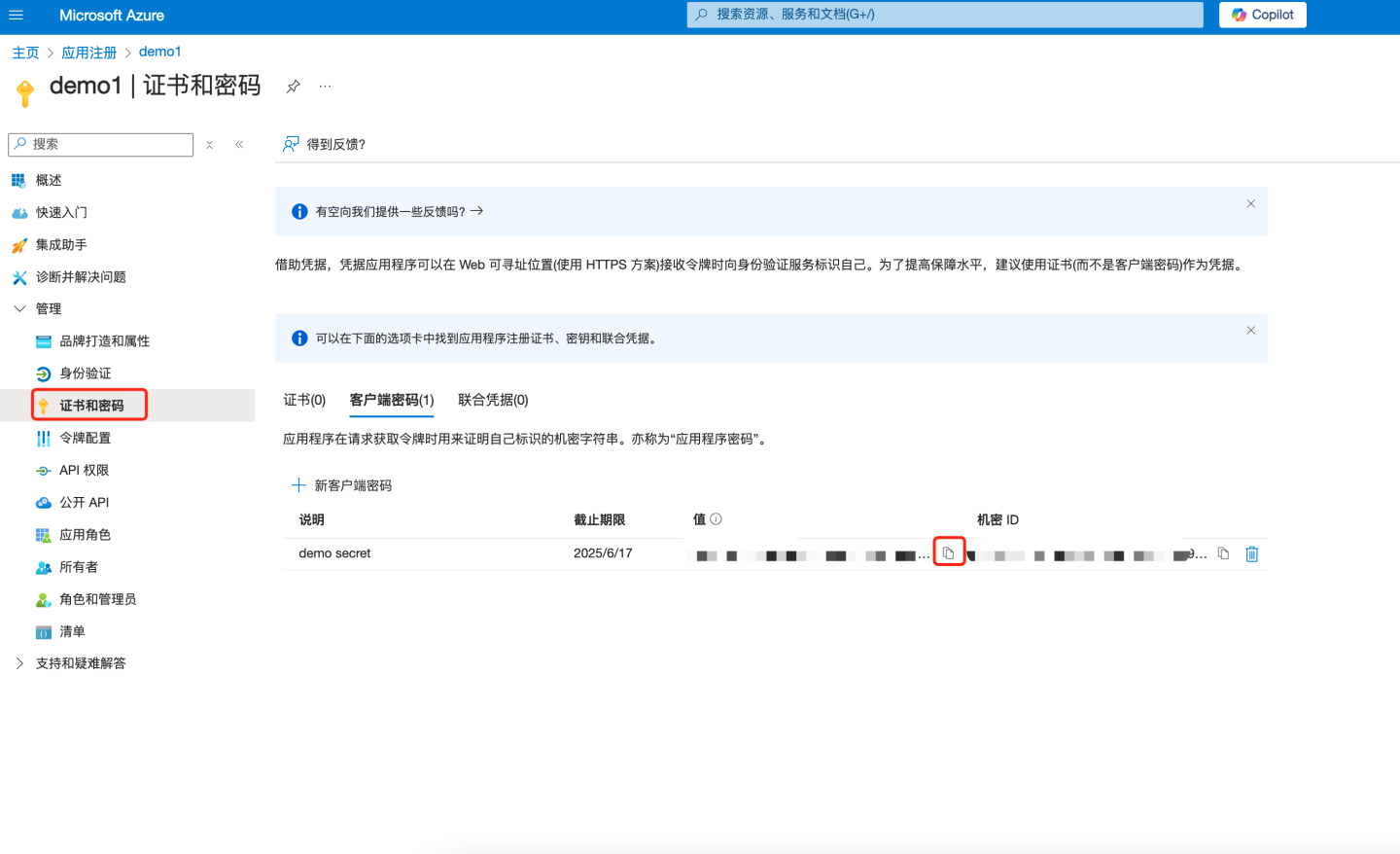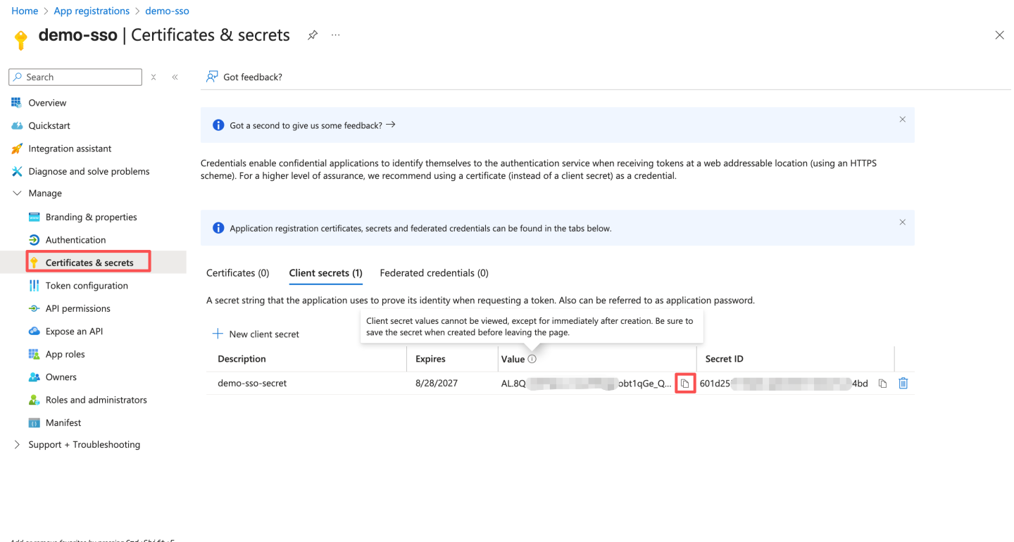 - 在" 值"下,选择" 复制到剪贴板 "以保存客户端密码值以供进一步使用(除了刚刚创建时,之后无法查看客户端密码值。请务必在创建时保存密码,然后再离开该页面)。将该密码配置到 HengShi Oauth2 认证方式中的 "Client Secret" 字段。