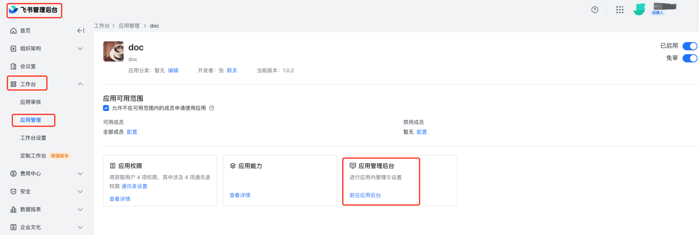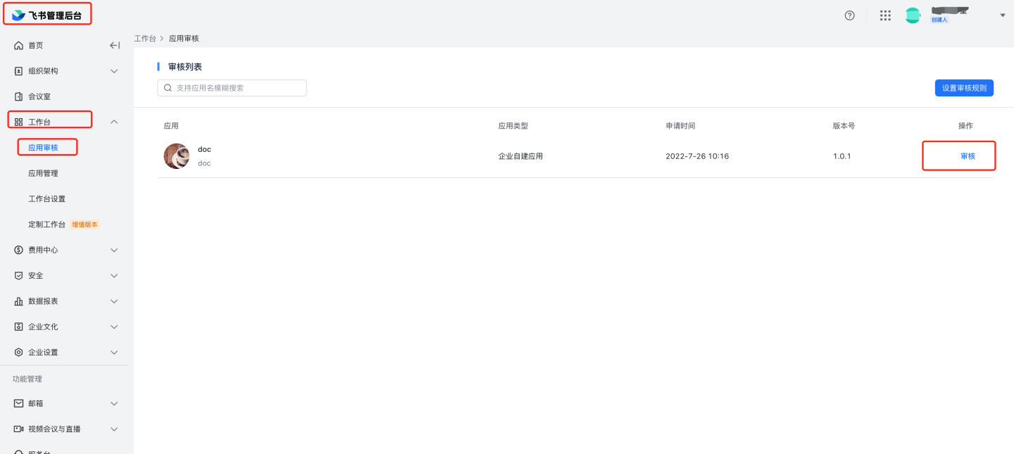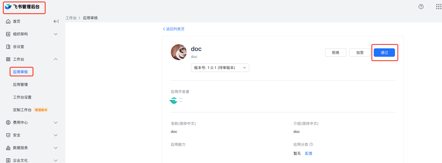 应用审核。 8.1 人工审核:进入飞书管理后台