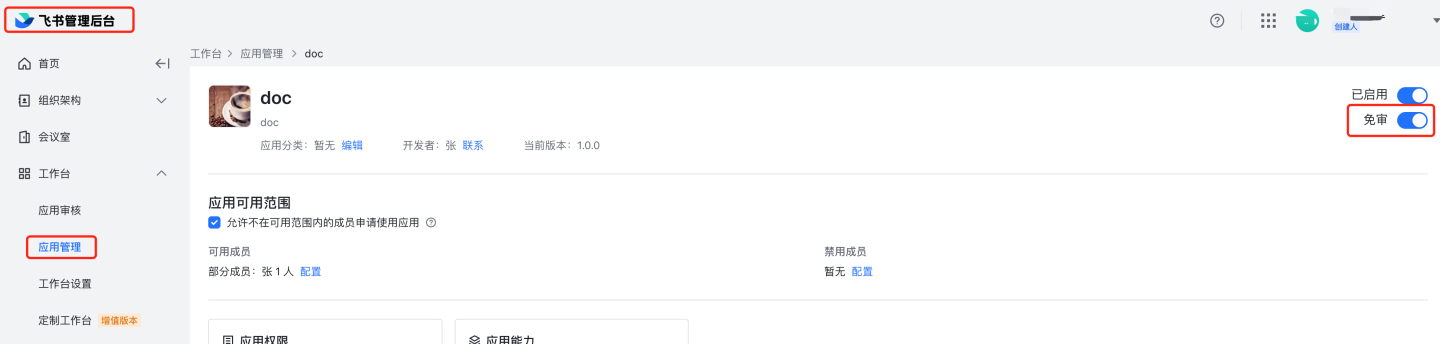 8.2 自动审核:进入飞书管理后台,应用管理, https://bc0nlvsmah.feishu.cn/admin/appCenter/manage选择需要设置自动审核的应用,点击配置,打开免审功能。