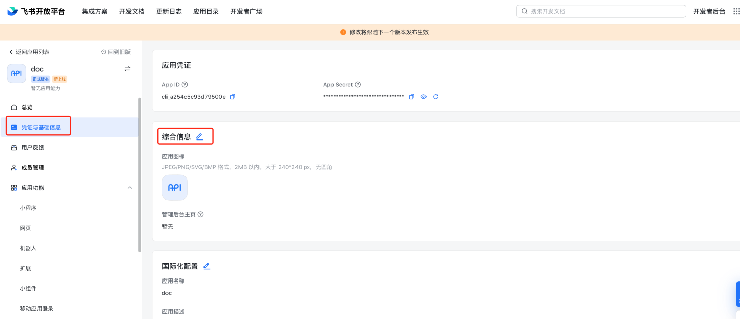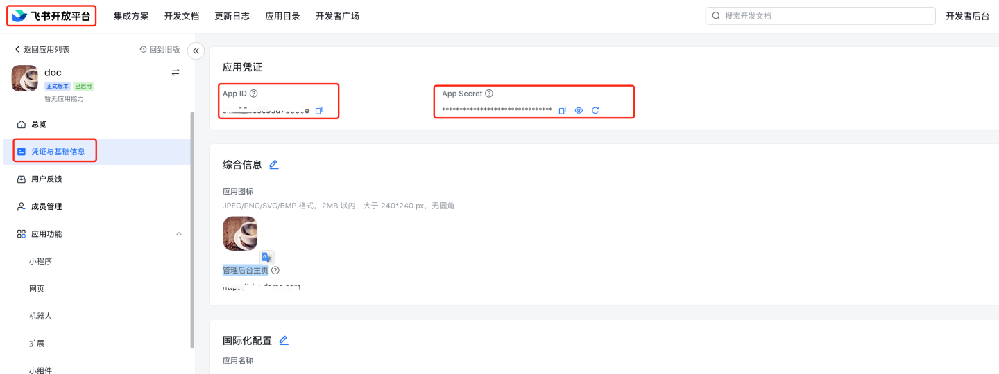 - 查看 App ID,App Secret 进入飞书开放平台,选择具体应用,查看 App ID 和 App Secret。