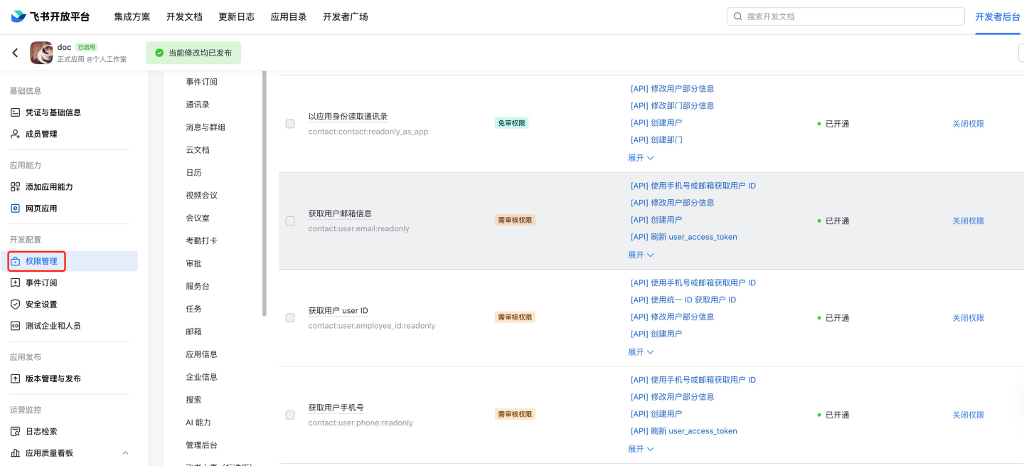飞书需要权限一览表: