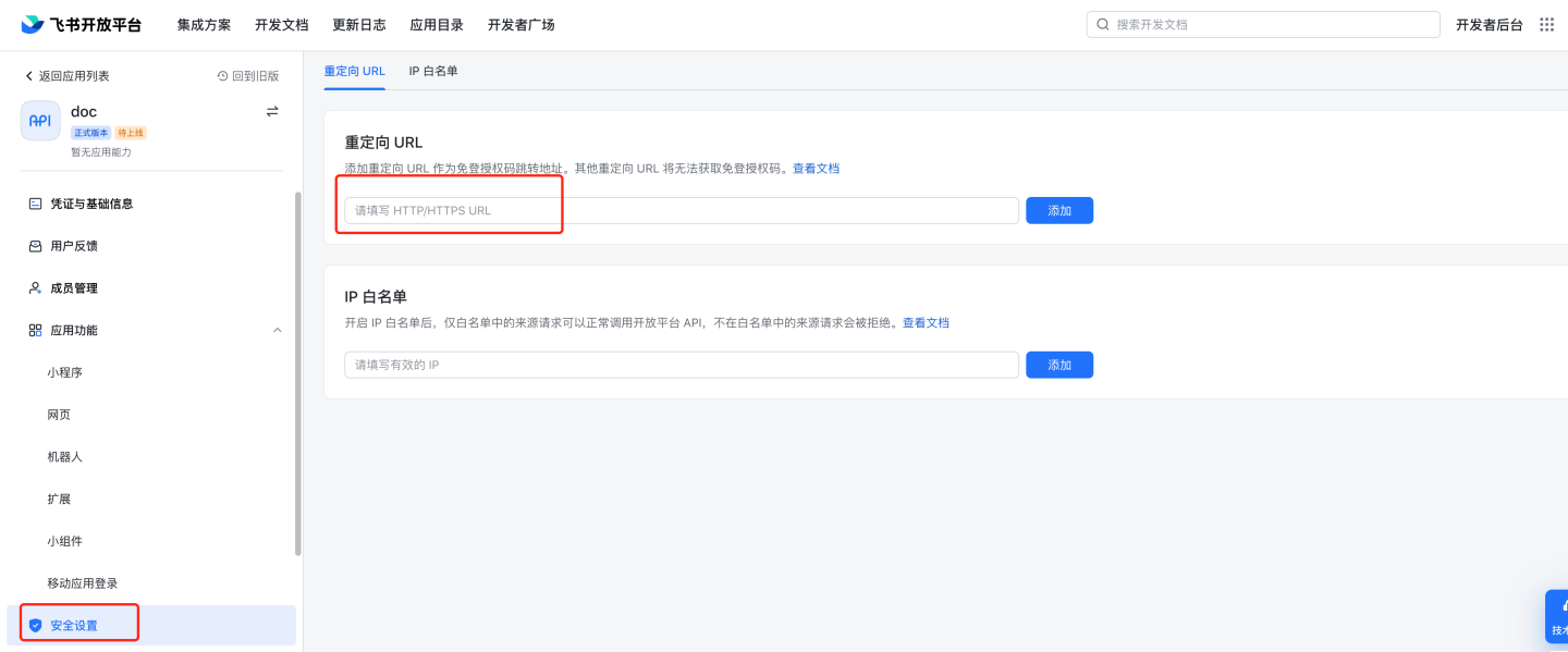 安全设置,配置重定向 URL。
