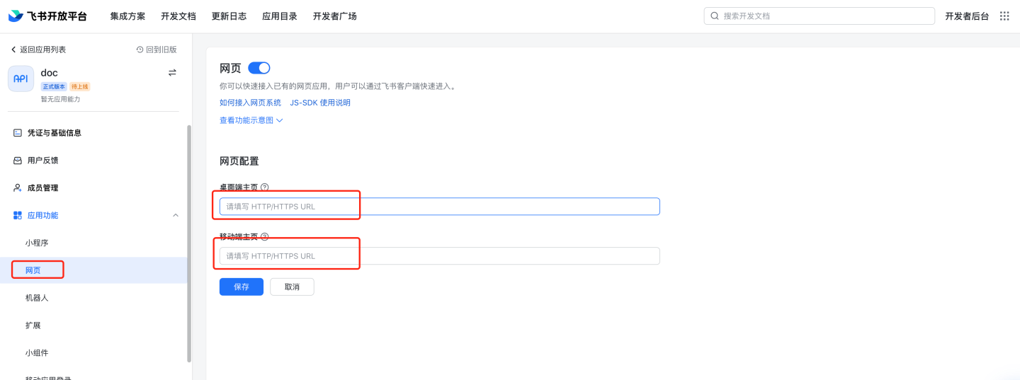 配置应用功能,网页,填写桌面端主页和移动端主页,具体地址可以根据需要修改,activeAuth,larkLoginType 两个参数是固定的。 桌面端主页