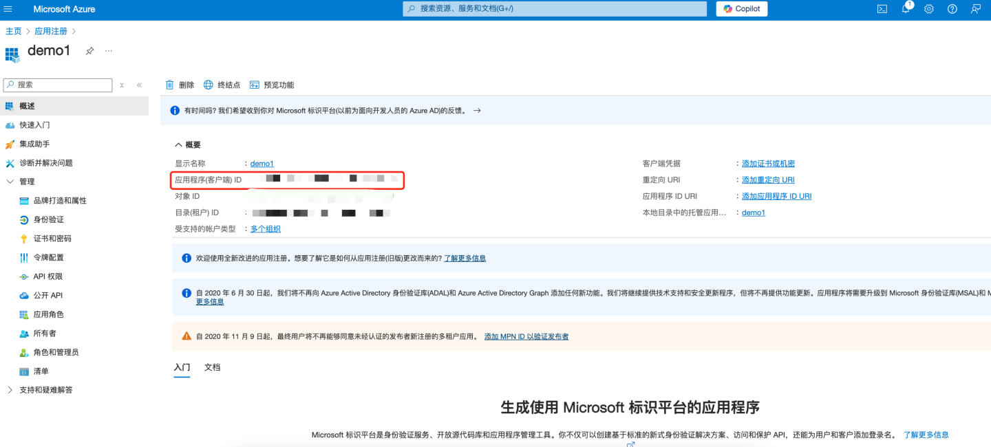 - 应用已经在 Entra ID Microsoft注册。 此时会显示应用概述页。记录 "应用程序(客户端的应用ID)" 信息,将 "应用程序(客户端的应用ID)" 配置到 HengShi Oauth2 认证方式中的 "Client ID" 字段。