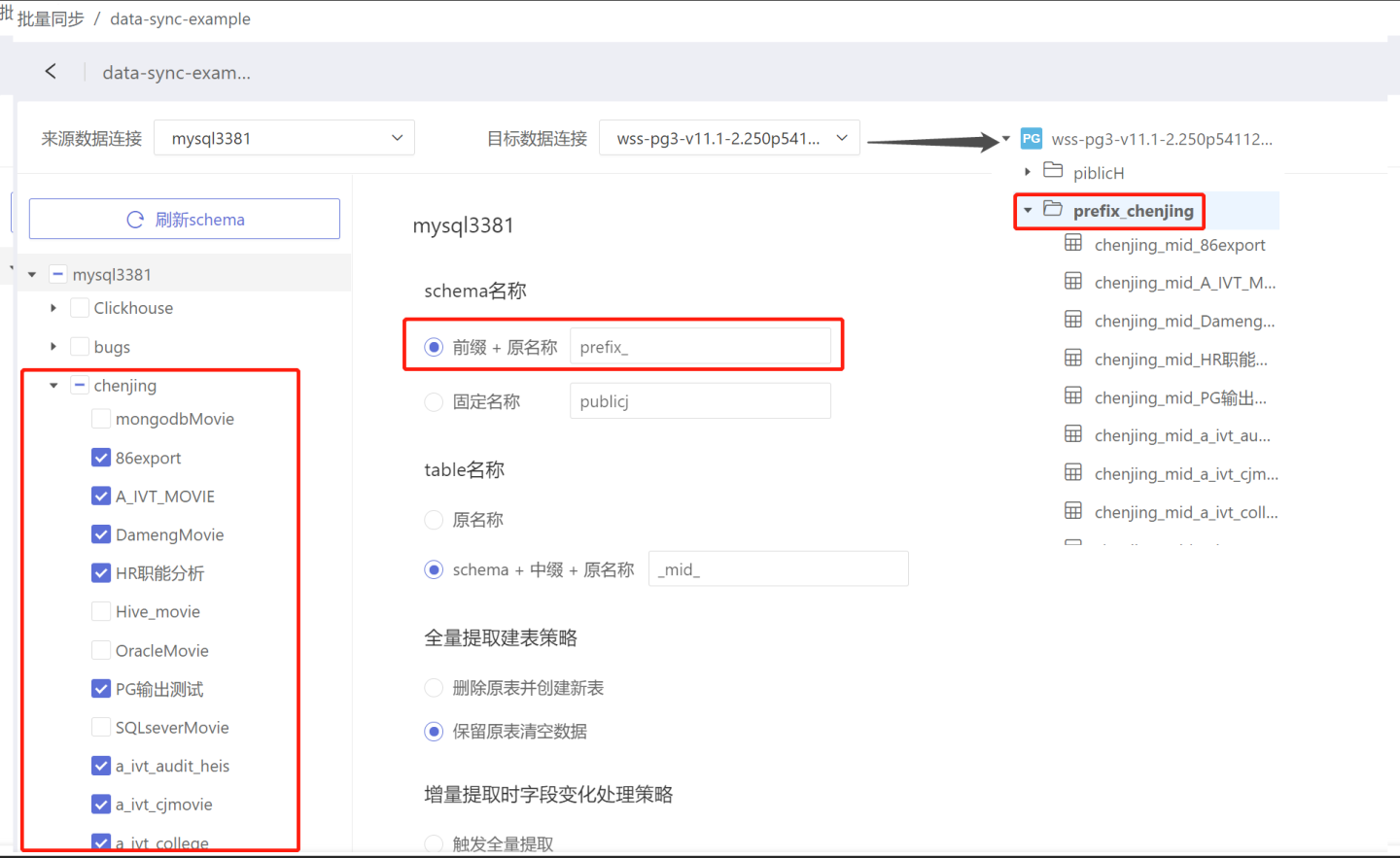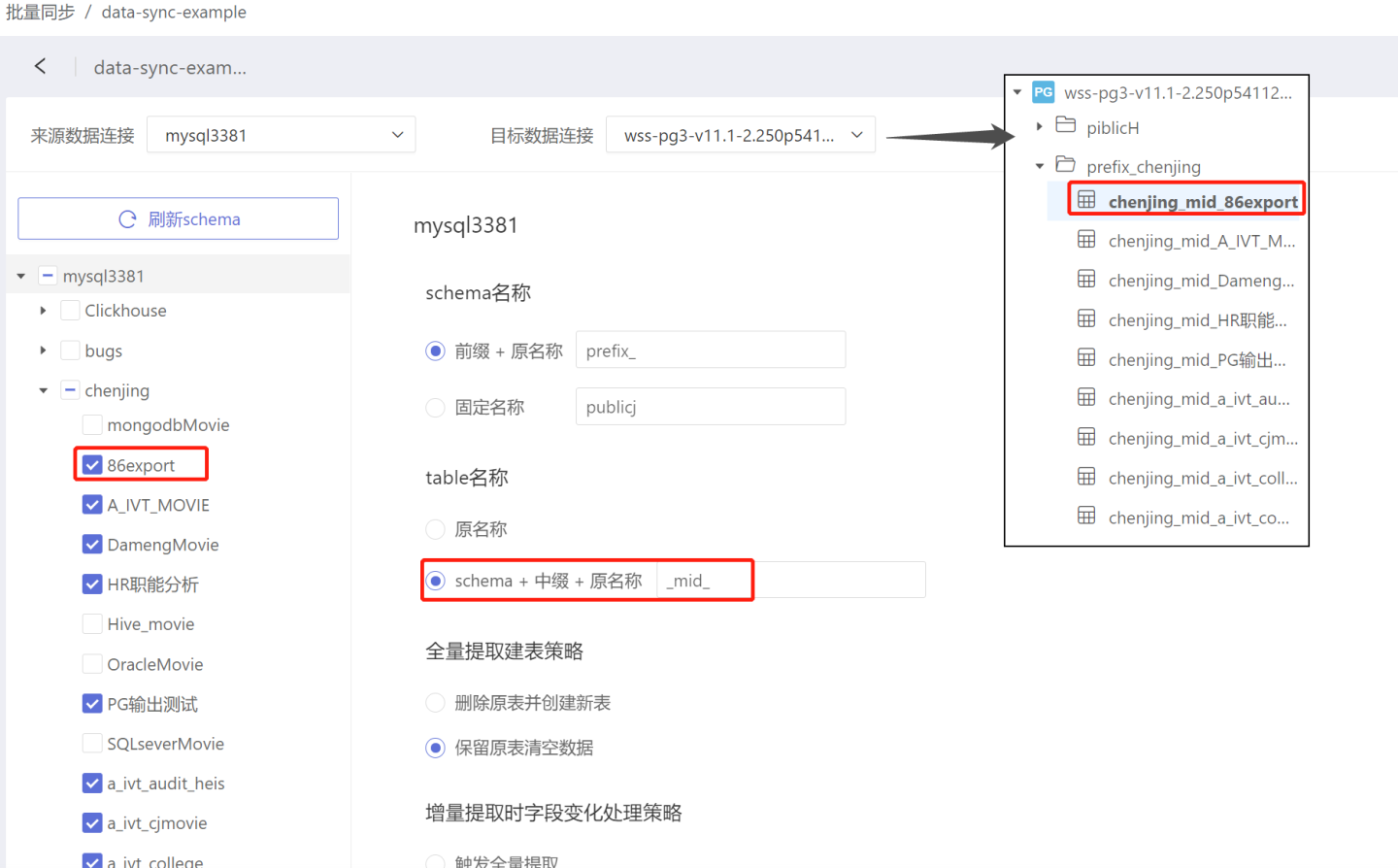 - schema+中缀+原名称:数据同步后,表的名称变为“schema”+“中缀”+“原名称”。如图将中缀设为“_mid_”时,表86export 同步后名称改为 chenjing_mid_86export。中缀没有默认值,需要按需填写。