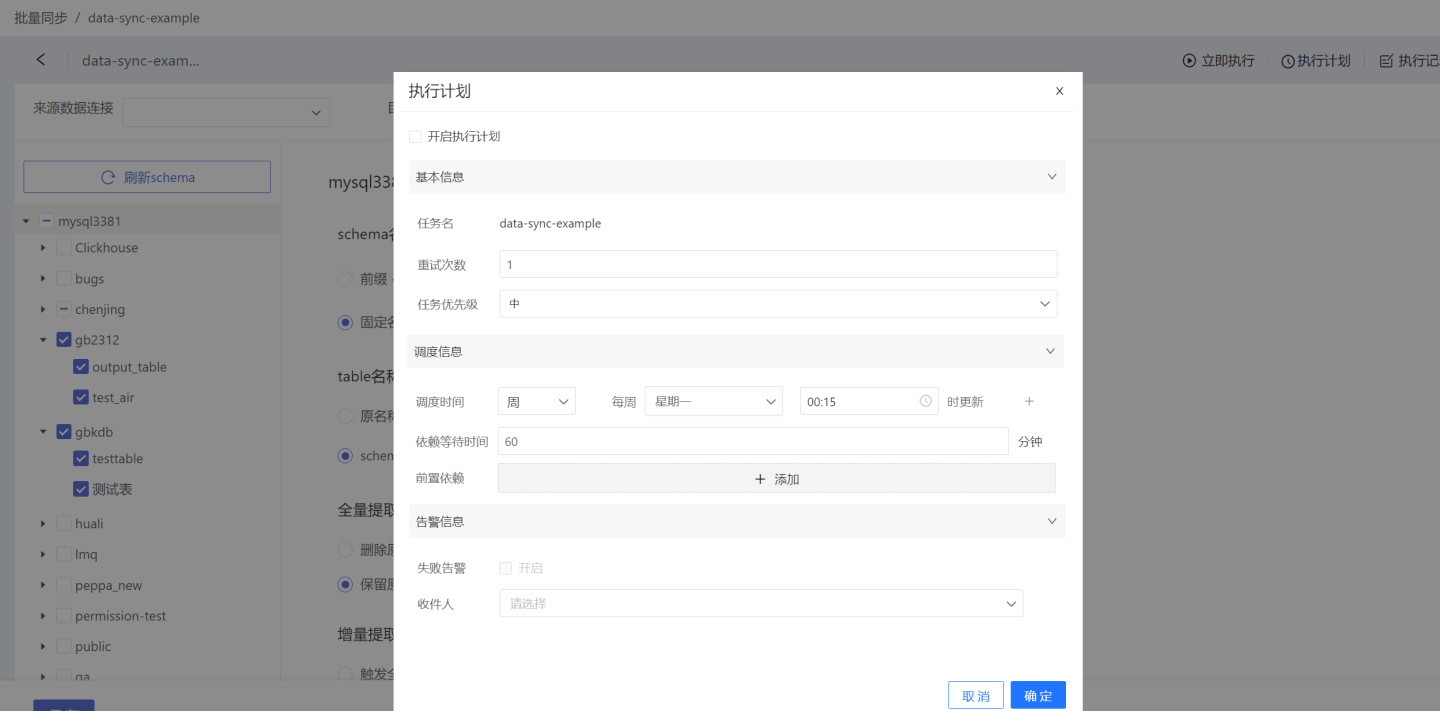 执行计划:即设定同步计划,由系统触发数据同步操作。点击右上角的执行计划,进入执行计划设置页面,设置计划的基本信息、调度信息、告警信息。
