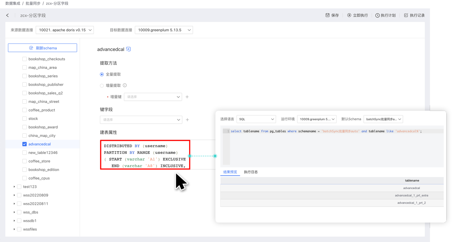 - 建表属性:在数据同步表创建过程中自定义分区字段和索引字段,对数据进行分散存储。 建表属性仅在第一次建表时生效。 目前支持建表属性的数据源包括 Greenplum、Apache Doris、StarRocks 和 ClickHouse。