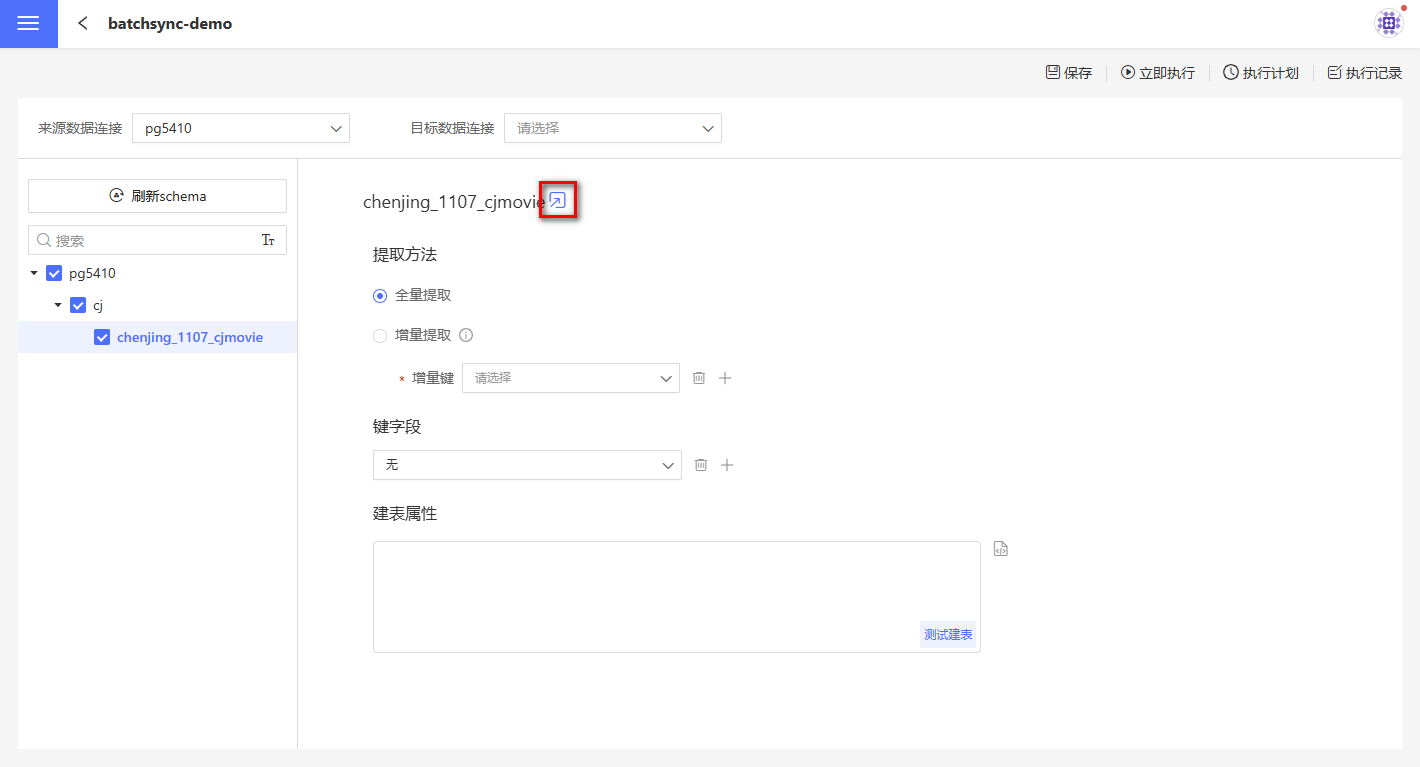 1.单表快捷同步 数据集成支持单表快捷同步。在全量提取少数表时,设置目的数据连接后,找到对应的表,点击图标即可完成表同步。