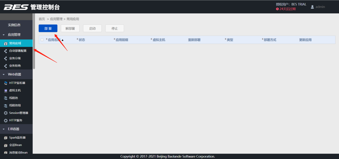 部署后 启动、停止 操作可通过界面中按钮进行操作