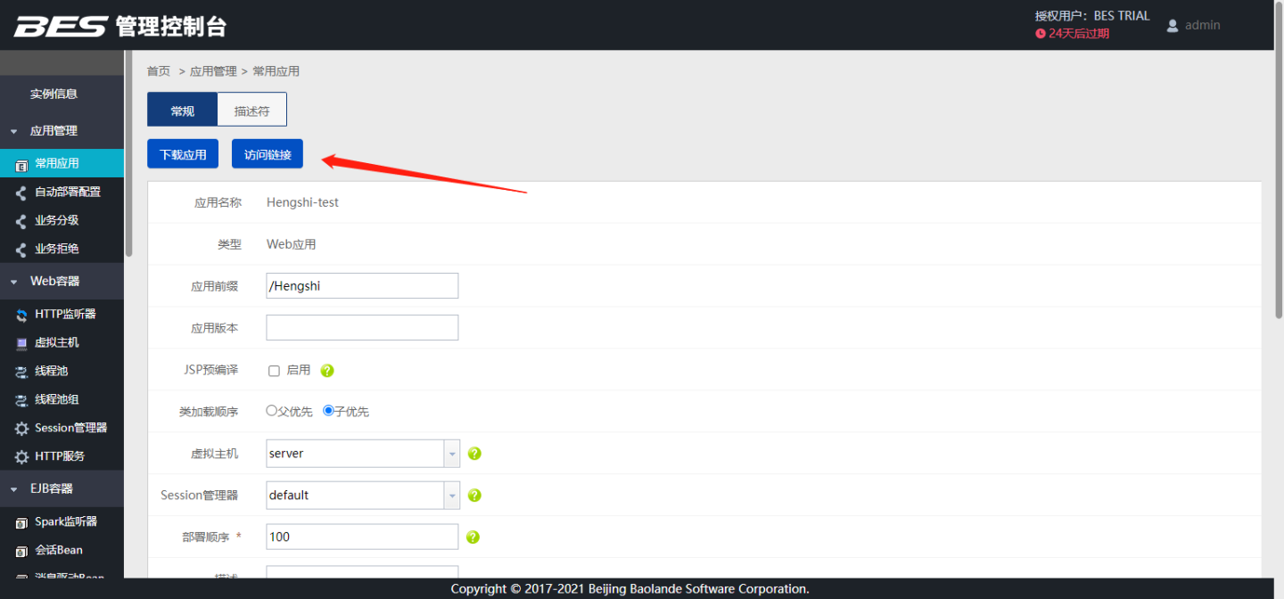 部署成功后可以通过点击应用名称,点击访问链接活得服务访问地址进行访问