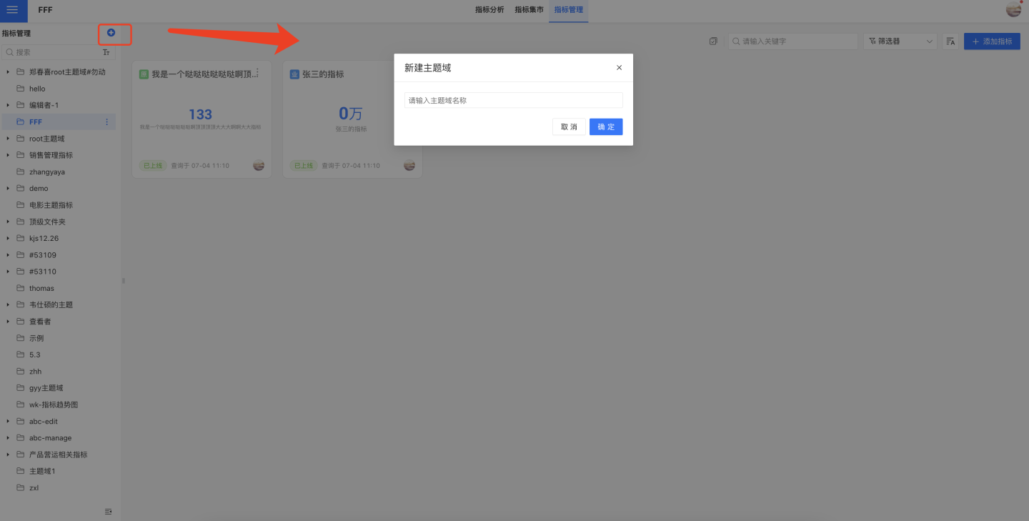 1.点击指标管理下的蓝色“+”,在弹窗中输入主题名称,点击确定,即在指标管理下创建了一个新的业务主题。