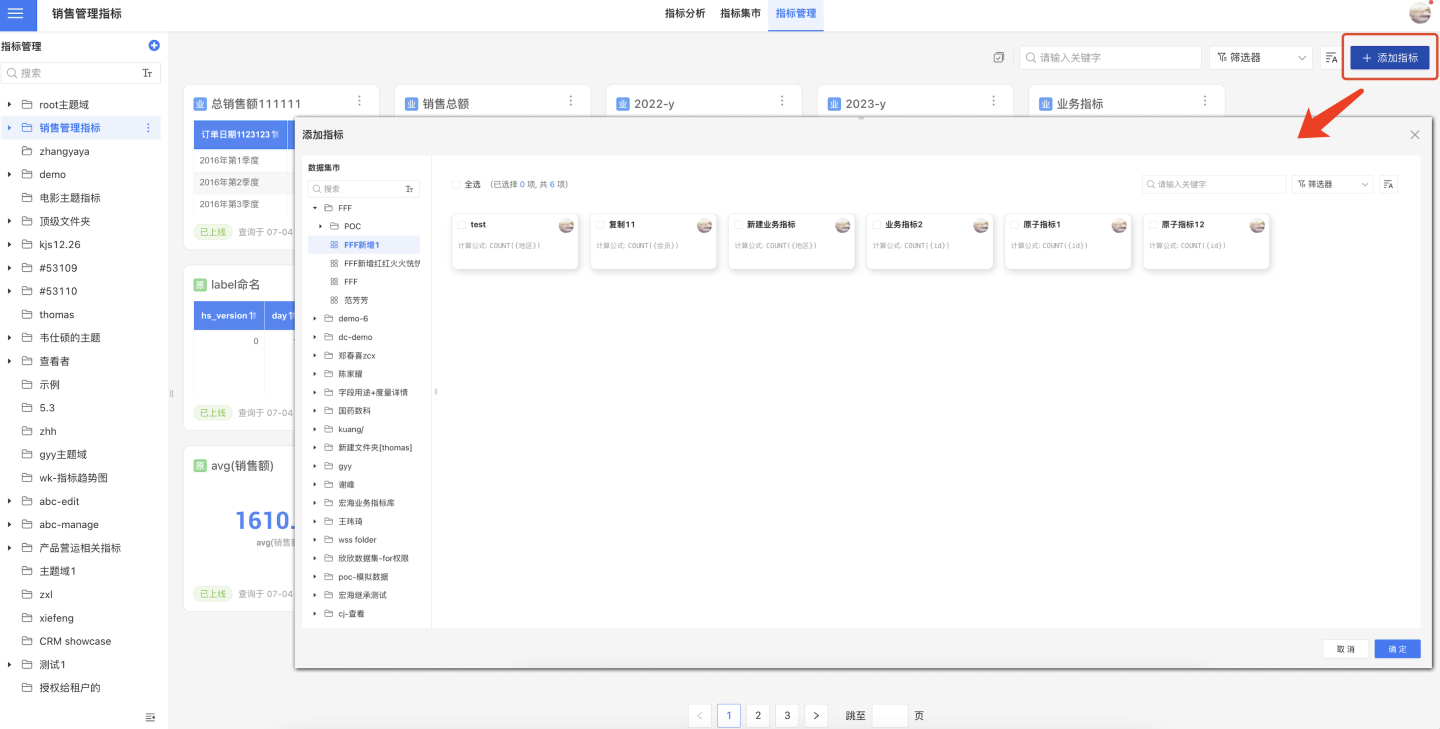 2.为业务主题下添加指标,在该业务主题下点击“添加指标”,选择需要添加的指标。可以通过筛选器,筛选不同类型的指标。
