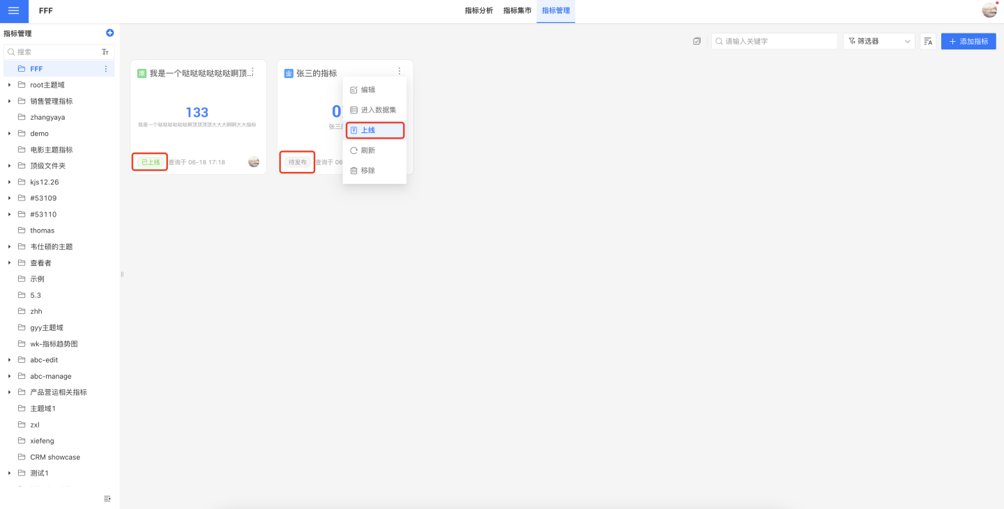 业务主题和其子主题中都可以添加指标,对指标进行管理。主题中的指标可以进行上线、下线、移除等相关操作。