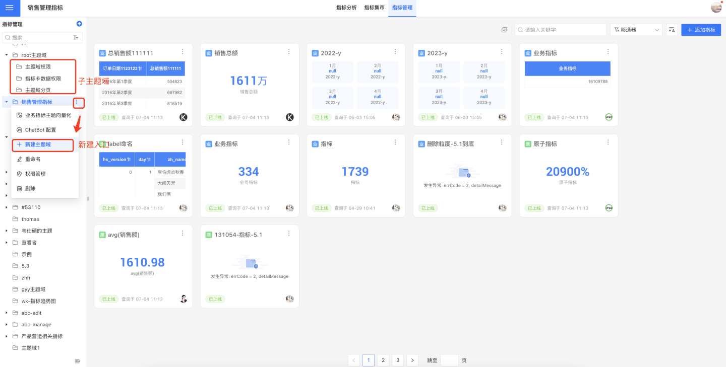 指标管理由业务主题组成,每个业务主题包含指标和子主题。下面介绍如何创建业务主题和添加指标。