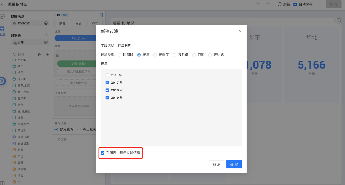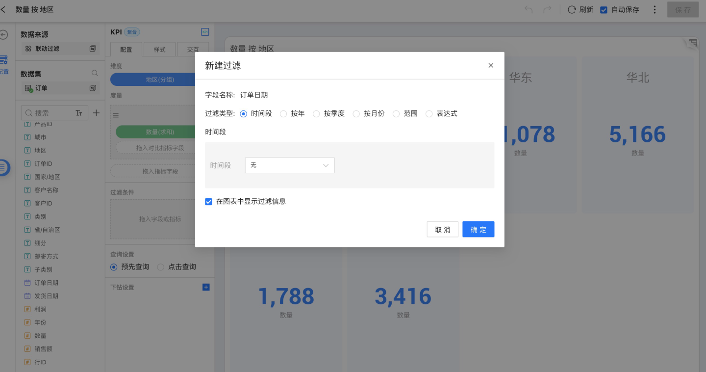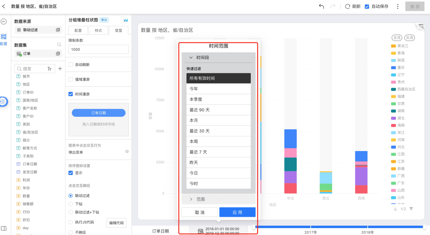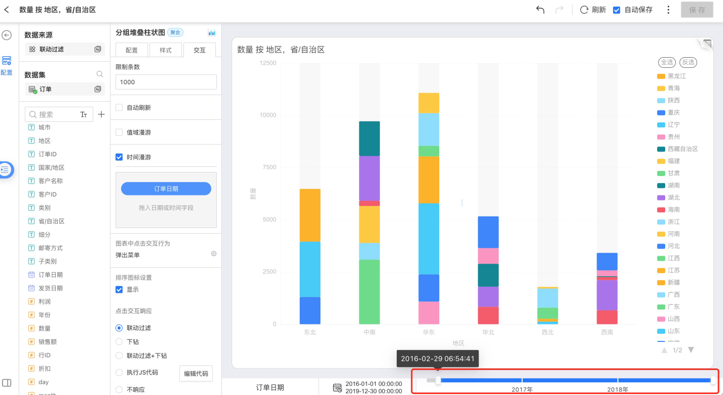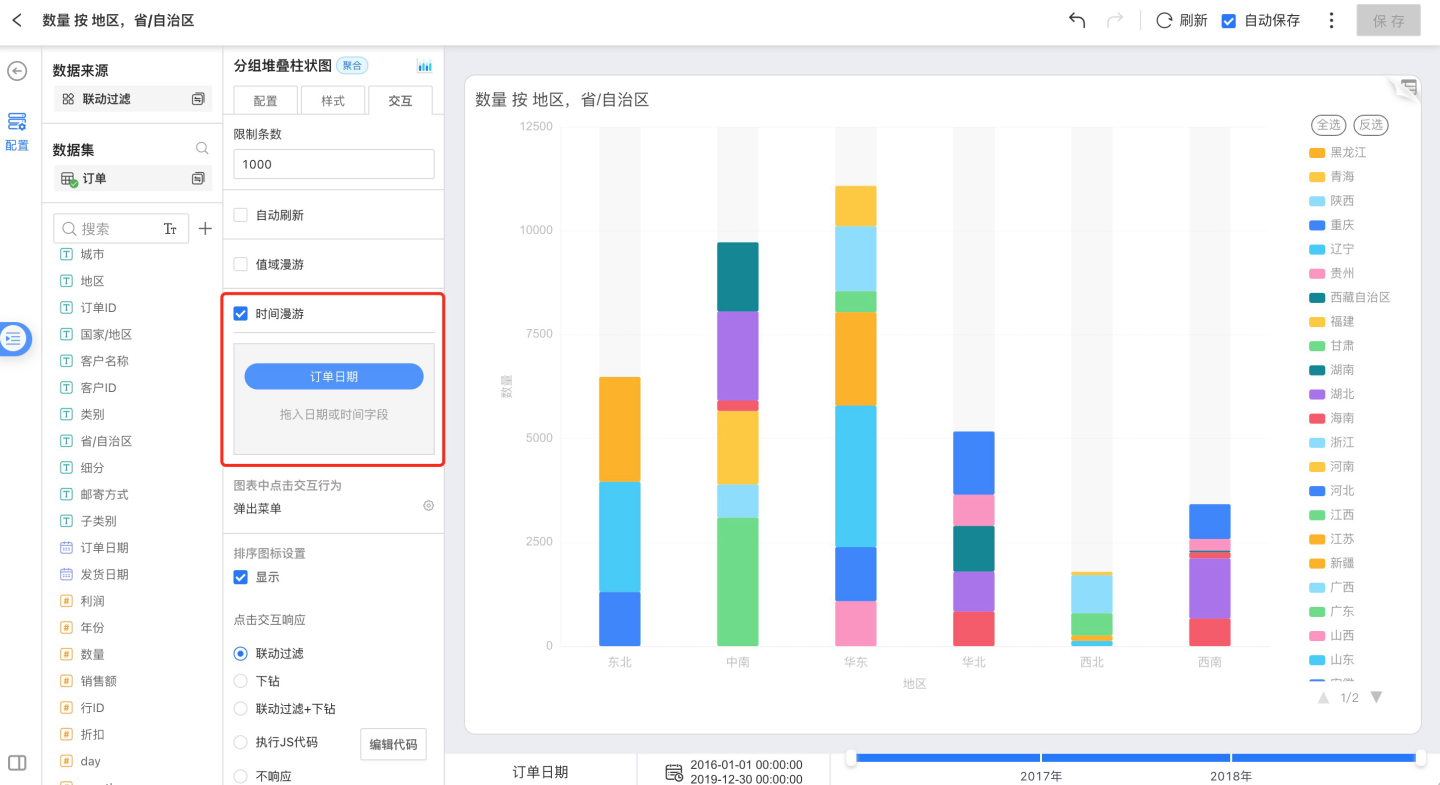 打开显示时间漫游,将字段中的时间字段拖入框内,可以在图表界面上展示时间轴,方便拖动查看不同时间范围内的数据。 时间轴可以通过三种方式来过滤数据: