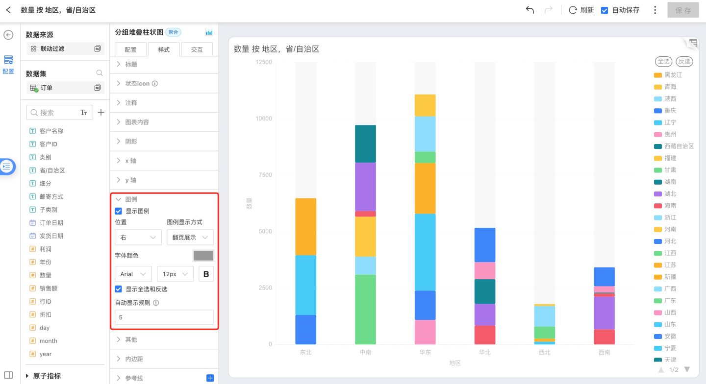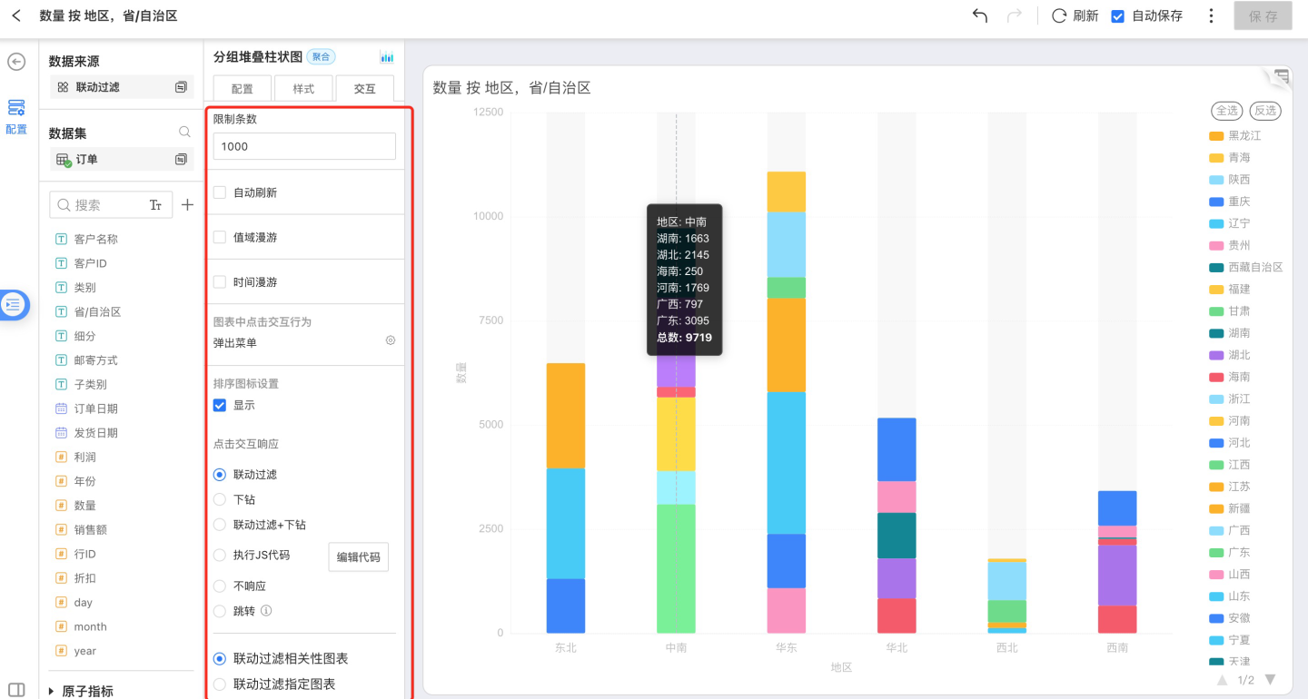 | 堆叠区域图 | 1 | 1~N | 数据源/字母/字段/手动排序 | 允许 | 各个度量 | 单选多选 | 无 | 维度分组 | 固定值 | 不允许 | 维度分组 |