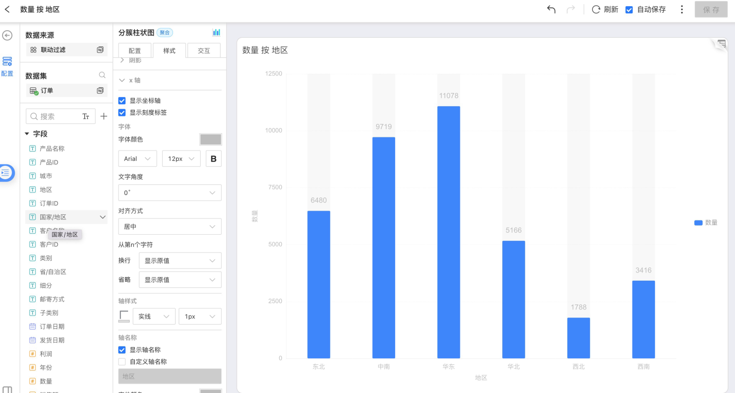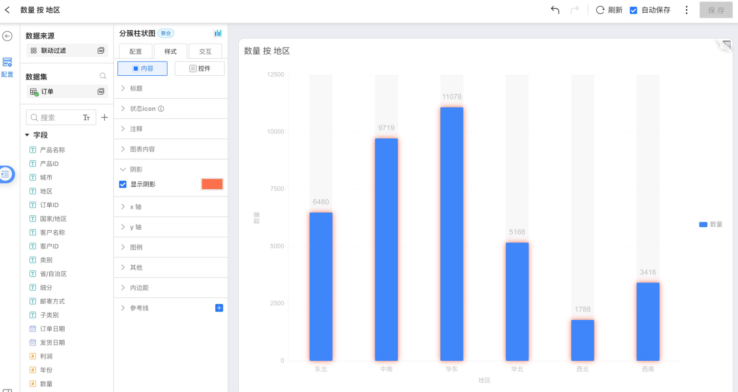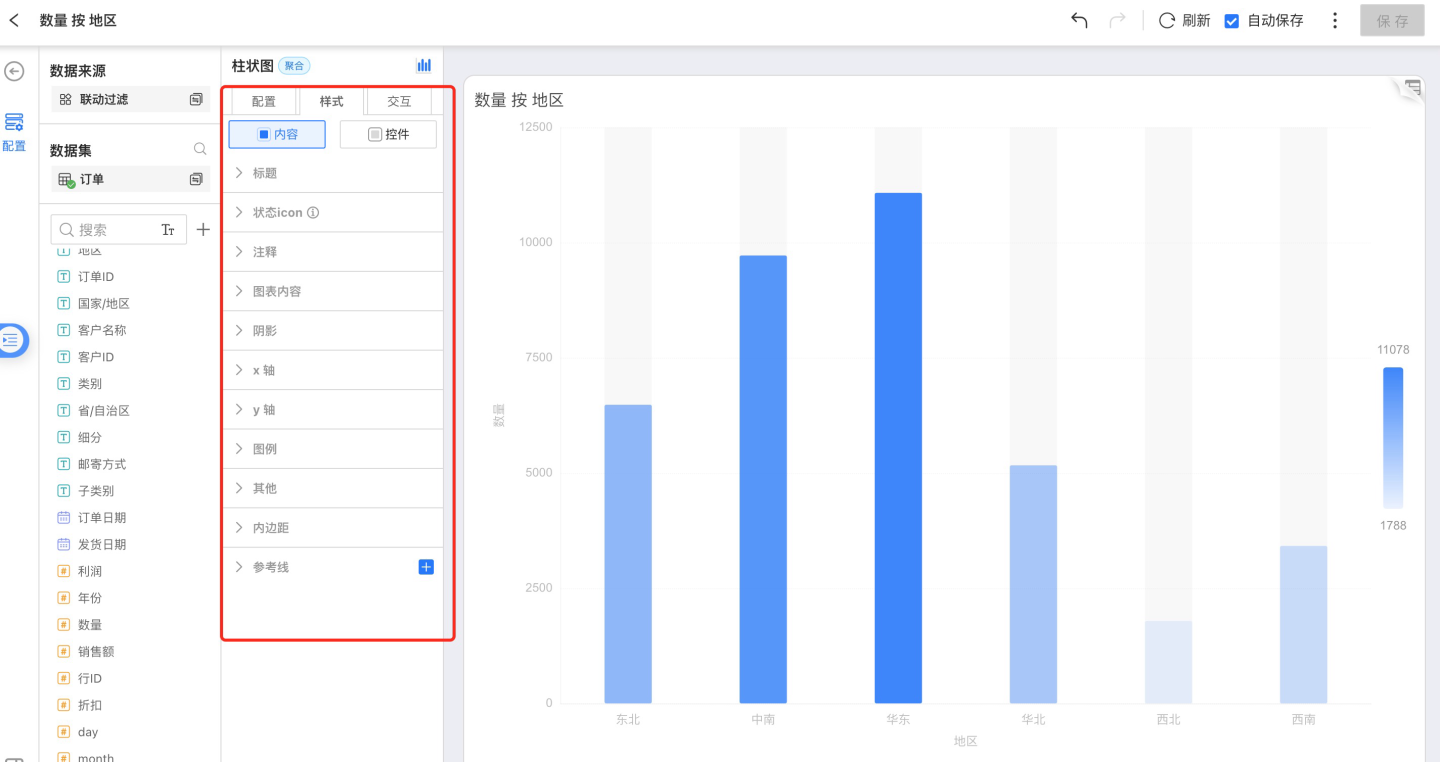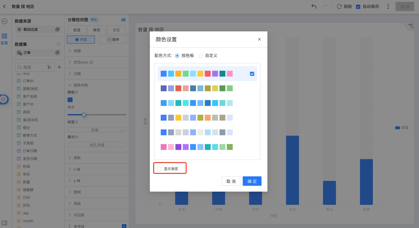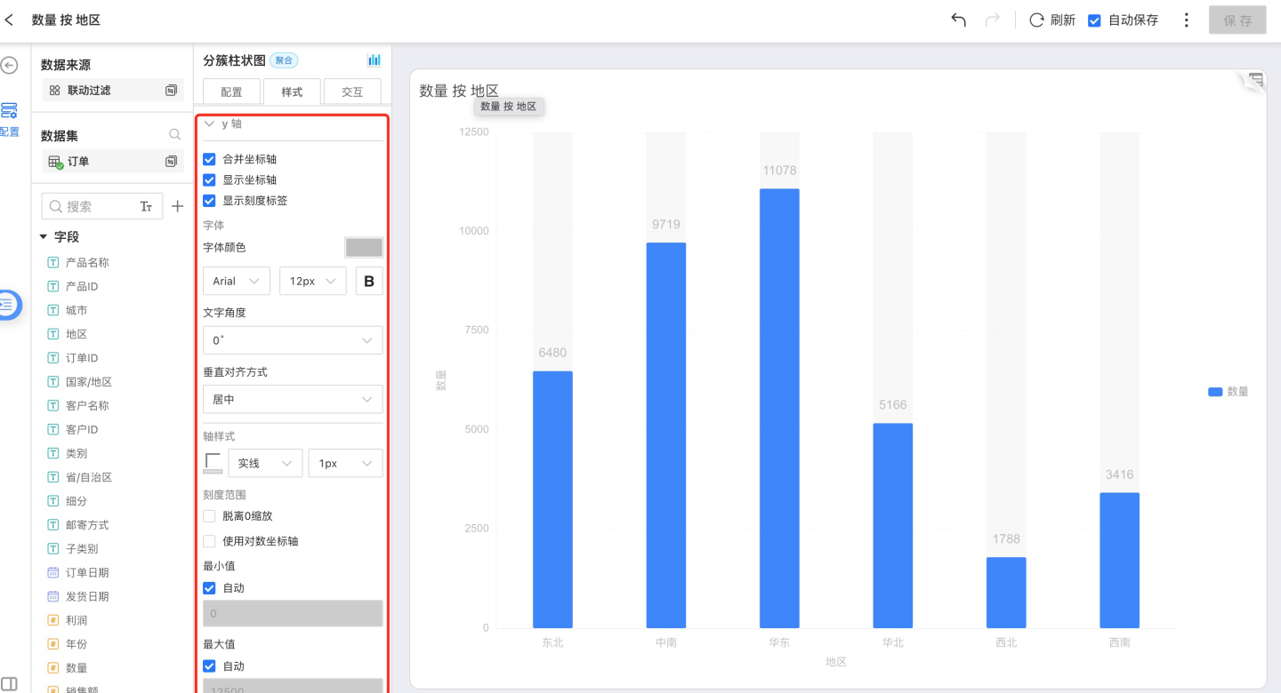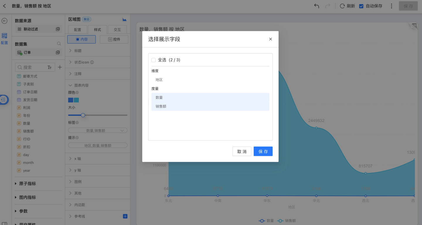 | 区域图 | 1 | 1~N | 数据源/字母/字段/手动排序 | 允许 | 各个度量 | 单选多选 | 度量值 | 维度分组 | 固定值/计算值 | 允许 | 维度分组 |
