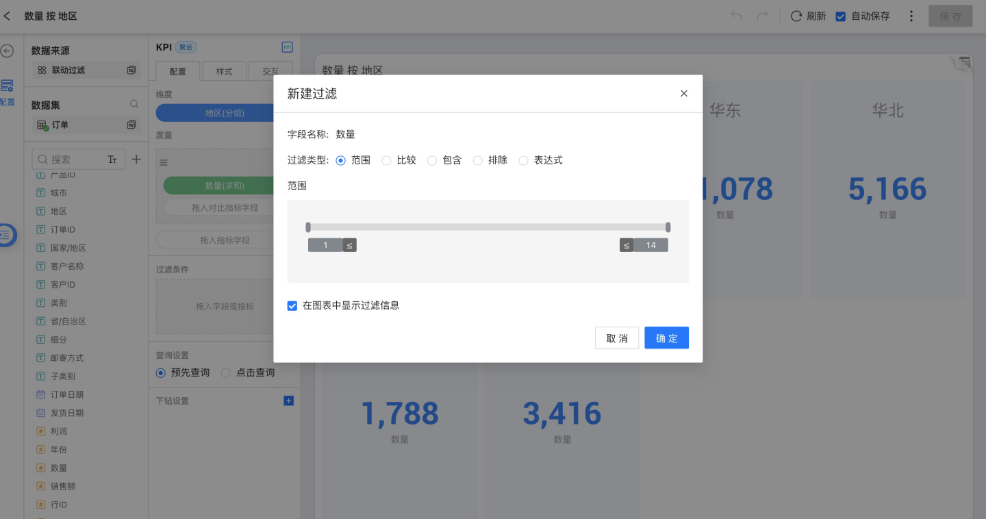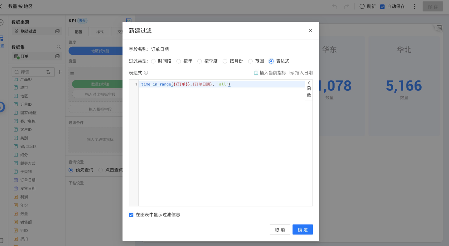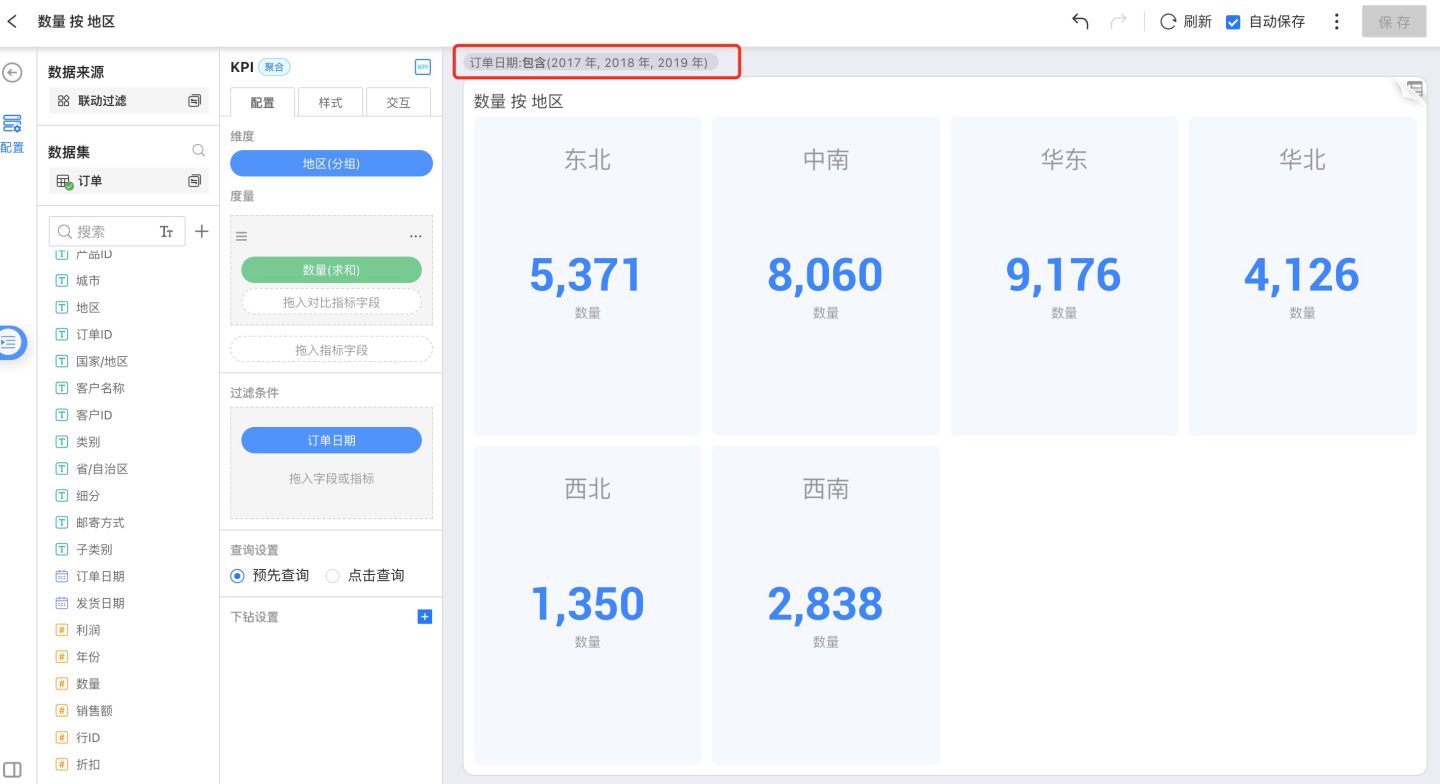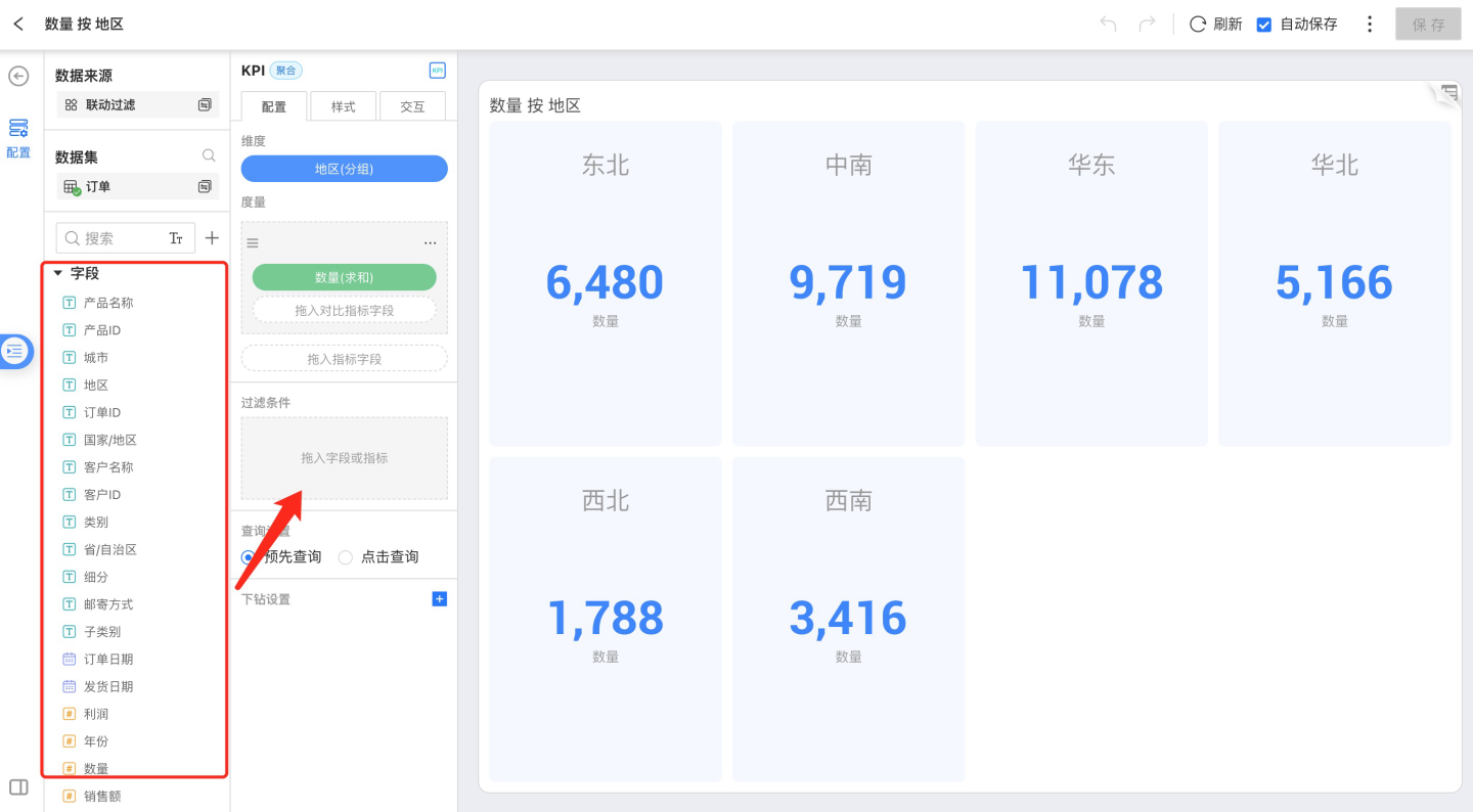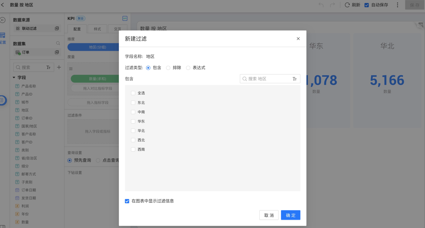 | 区域图 | 1 | 1~N | 数据源/字母/字段/手动排序 | 允许 | 各个度量 | 单选多选 | 度量值 | 维度分组 | 固定值/计算值 | 允许 | 维度分组 |