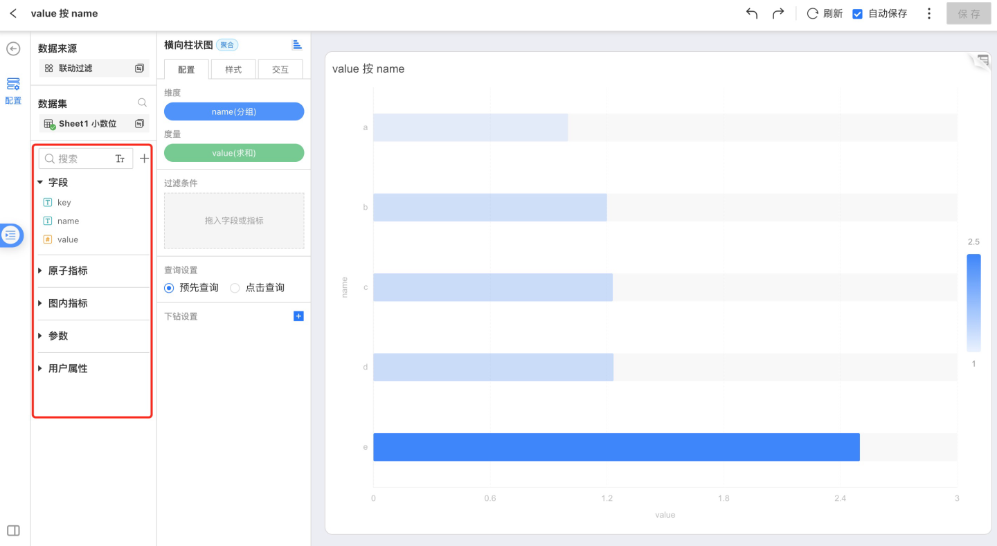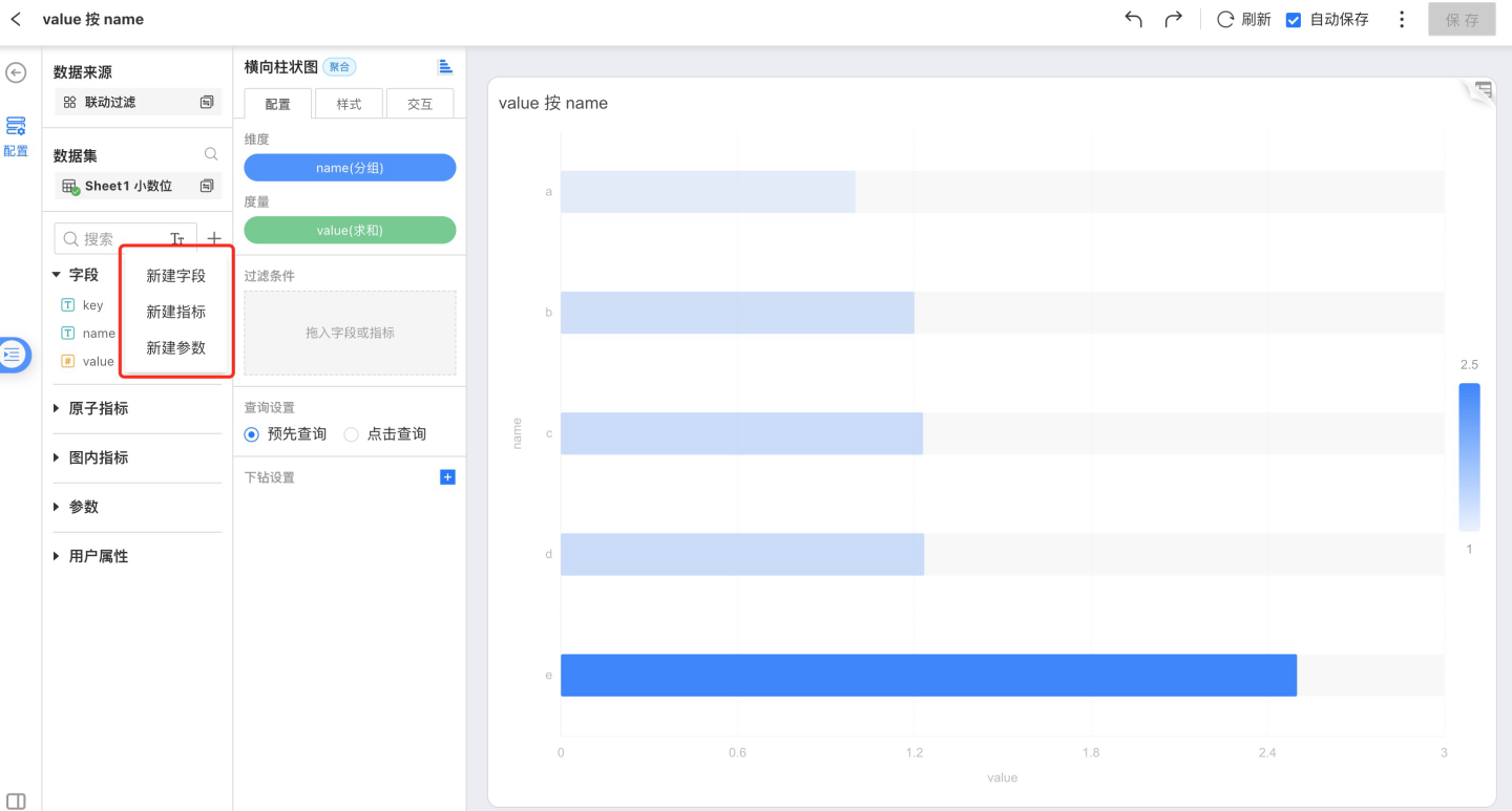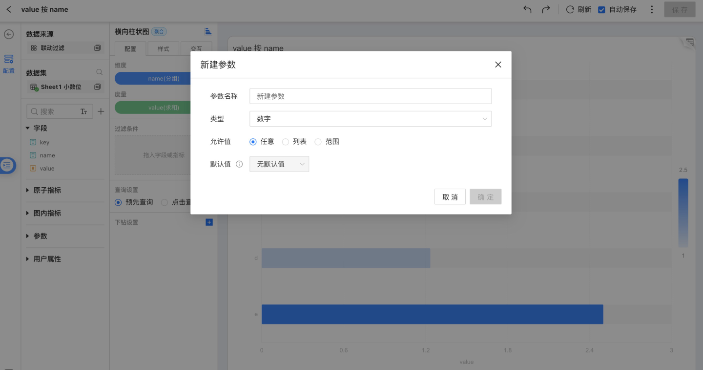 | 柱状图 | 1 | 1 | 数据源/字母/字段/手动排序 | 允许 | 默认度量的范围 | 无 | 度量值 | 维度分组 | 固定值/计算值 | 允许 | 维度分组 |