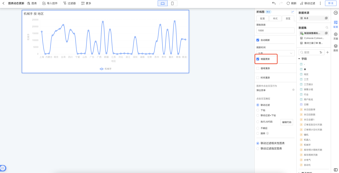 数据分析师想要制作出图表能根据实时数据动态更新展示的看板,在大屏上展示类似心电图的动态效果。可以开启 自动刷新 -> 增量更新 功能。