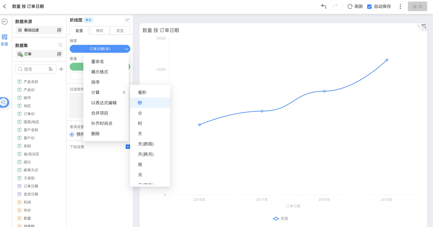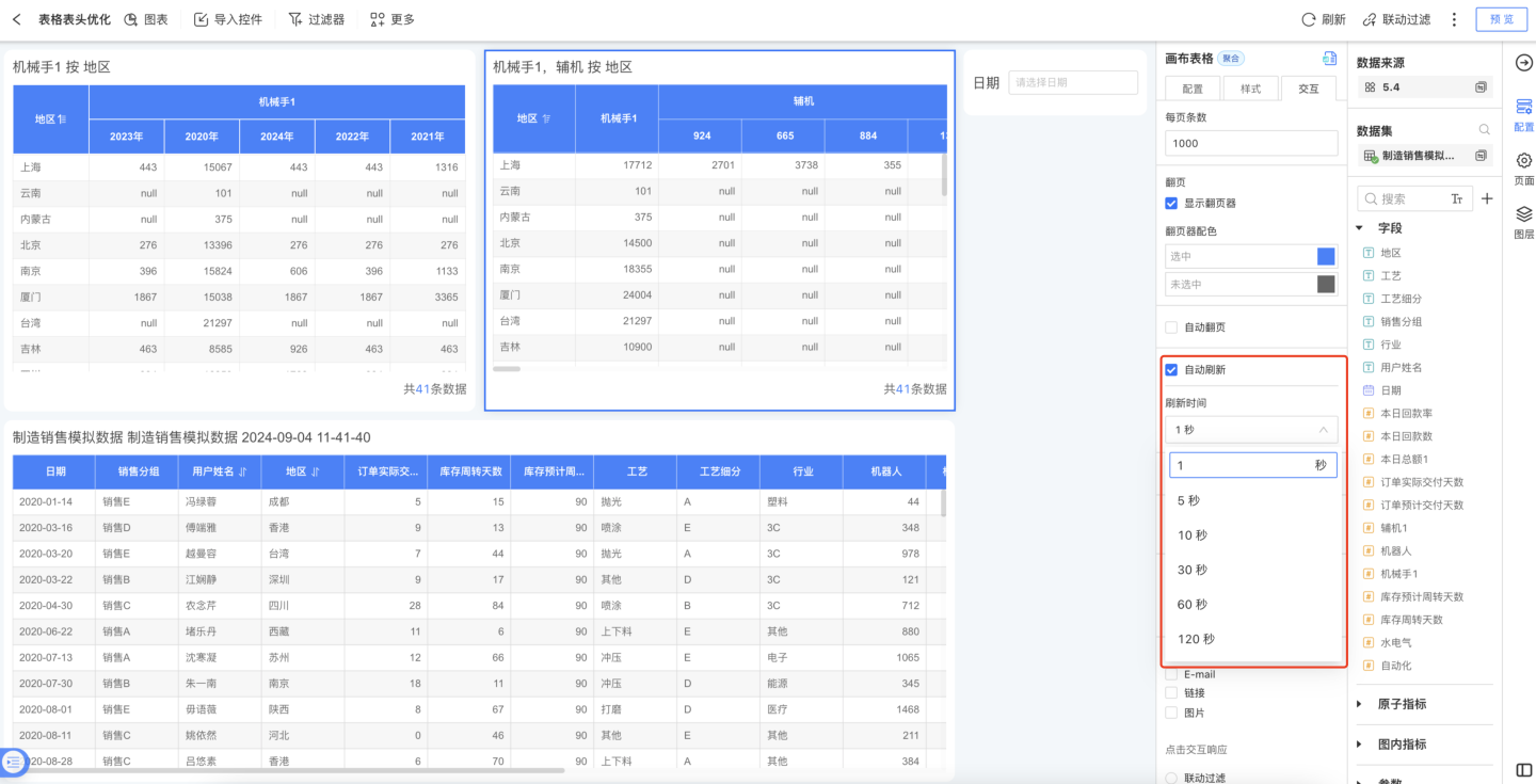 和仪表盘的刷新功能一样,自动刷新功能可以定期自动更新图表数据。开启自动刷新功能后,可以设置更新周期,自动刷新时间数值支持自定义。