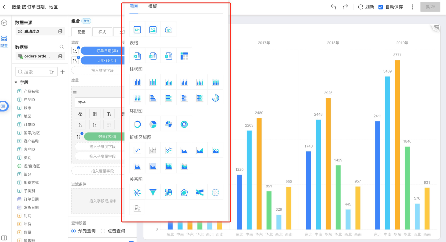 选择创建好的数据集,用该数据集中的数据创建所需图表,创建了关系的数据集会用线相互连接。