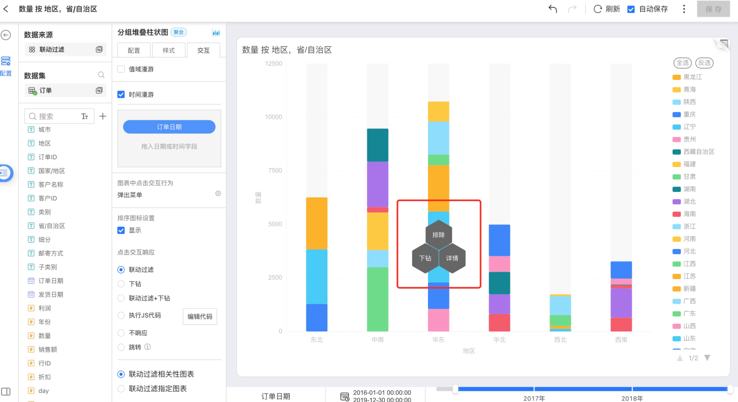 如果设置了下钻路径,打开图表,点击图表区域图表将直接以所选维度为过滤条件,以新选择的字段为维度重新出图。如果未设置下钻路径则无反应。